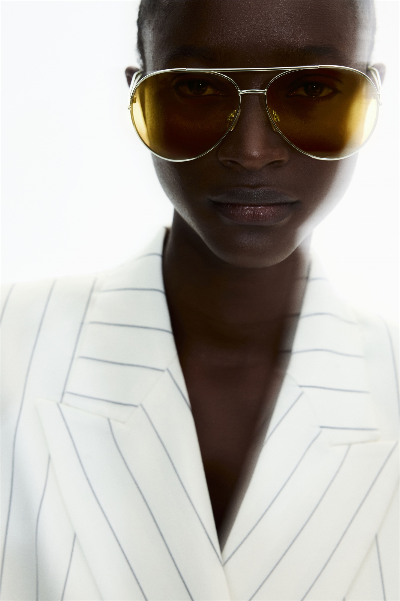 Солнцезащитные очки в стиле "авиатор" с металлической оправой и боковыми дужками, регулируемыми носовыми упорами и тонированными пластиковыми линзами с УФ-защитой.
