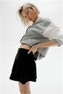Короткая юбка из мягкого джерси с заниженной талией, широким отложным поясом, сборкой по бедрам и расклешенным подолом.