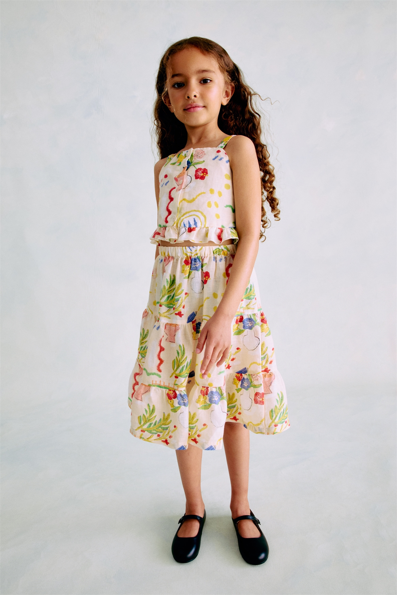 H&M Adorables. Комплект из топа на бретелях и юбки из воздушного льняного полотна с принтом по всей длине идеально подходит для теплых летних дней. Топ на бретелях с квадратным вырезом, пуговицами спереди и подолом с оборками. Юбка с регулируемой резинкой на талии и ярусами для придания дополнительного объема. Белье - нестареющий текстиль с легкой текстурой и быстросохнущими свойствами, который со временем становится мягче. Коллекция H&M Adorables - это подборка удобных и качественных вещей, не теряющих актуальности.
