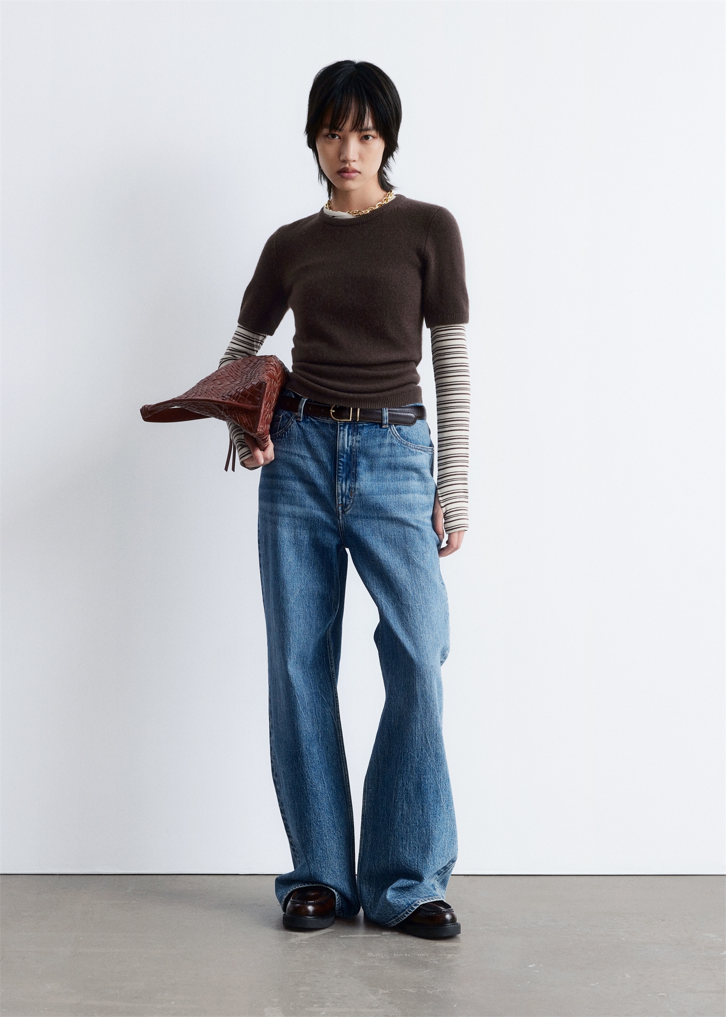 Эта футболка связана из 100% чистого кашемира, что придает ей мягкость и фактурность. Приталенный силуэт, круглый вырез, короткие рукава и ребристая отделка. Длина футболки: 54 см / 21,3" (размер S)