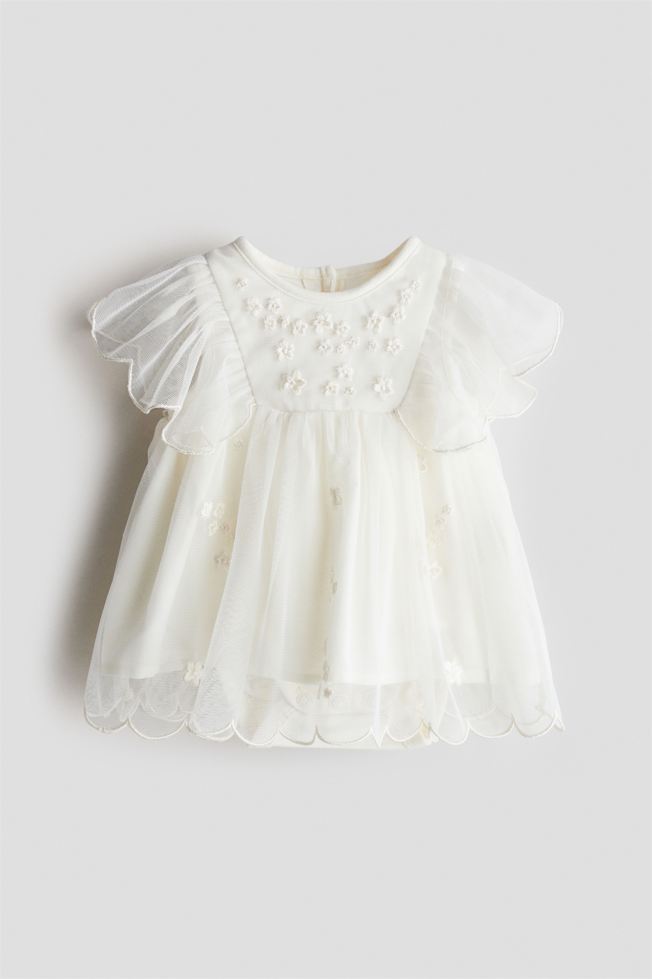 Платье из мягкой сетки с вышитыми деталями и вшитым боди из мягкого хлопкового джерси. Круглый вырез, узкий вырез и воланы с гребешком спереди, переходящие на плечи. Застежка на пуговицы сзади и объемная юбка с гребешковым подолом. На подкладке. Боди-комбинезон с кнопками внизу для удобства переодевания.