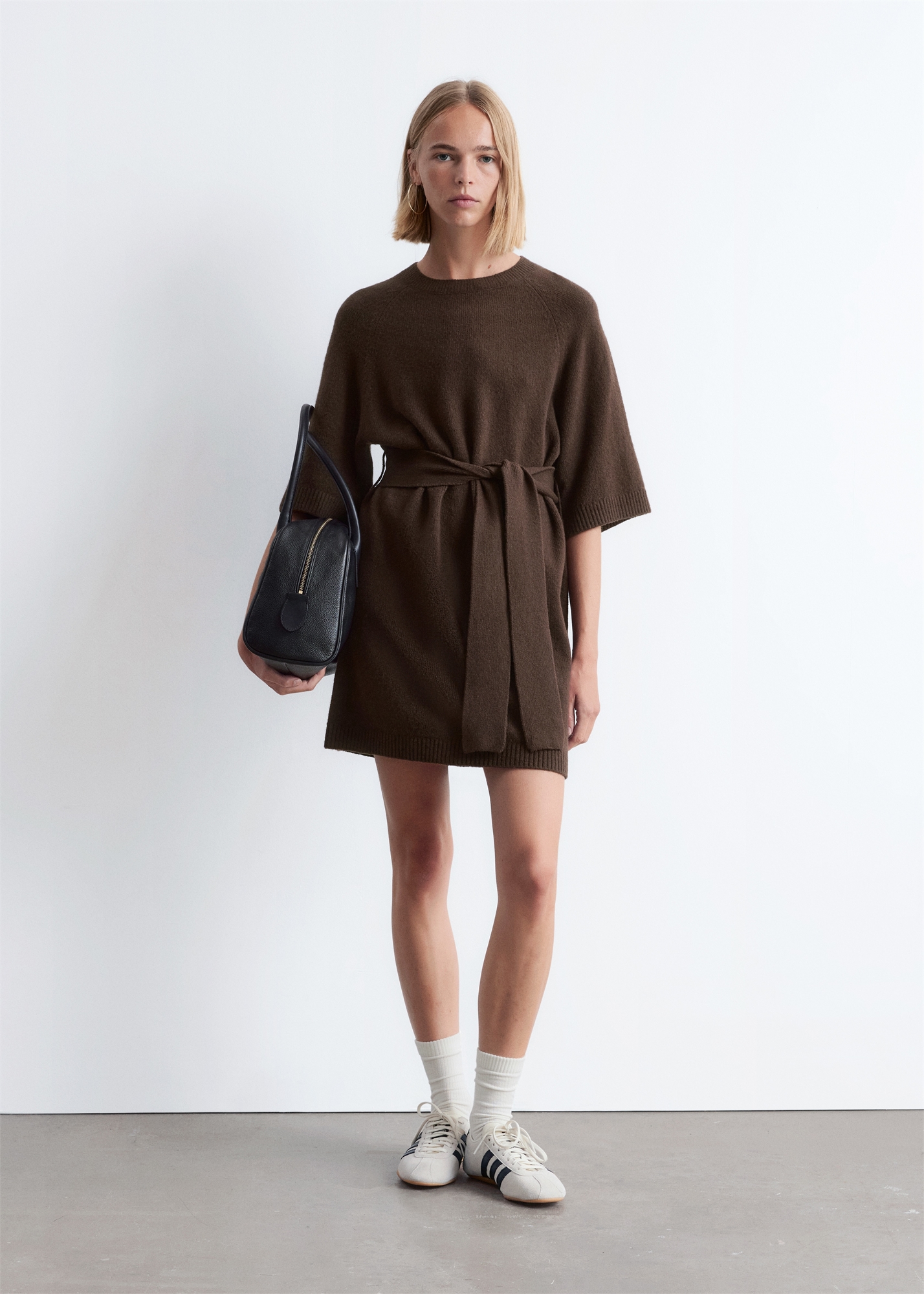 Трикотажное платье-футболка из мягкой смеси хлопка и шерсти прямого силуэта с короткими рукавами реглан, ребристой отделкой и подходящим поясом-самовязкой для определения талии. Носите его с сапогами до колена. Длина платья: 85 см / 33,5” (размер S)