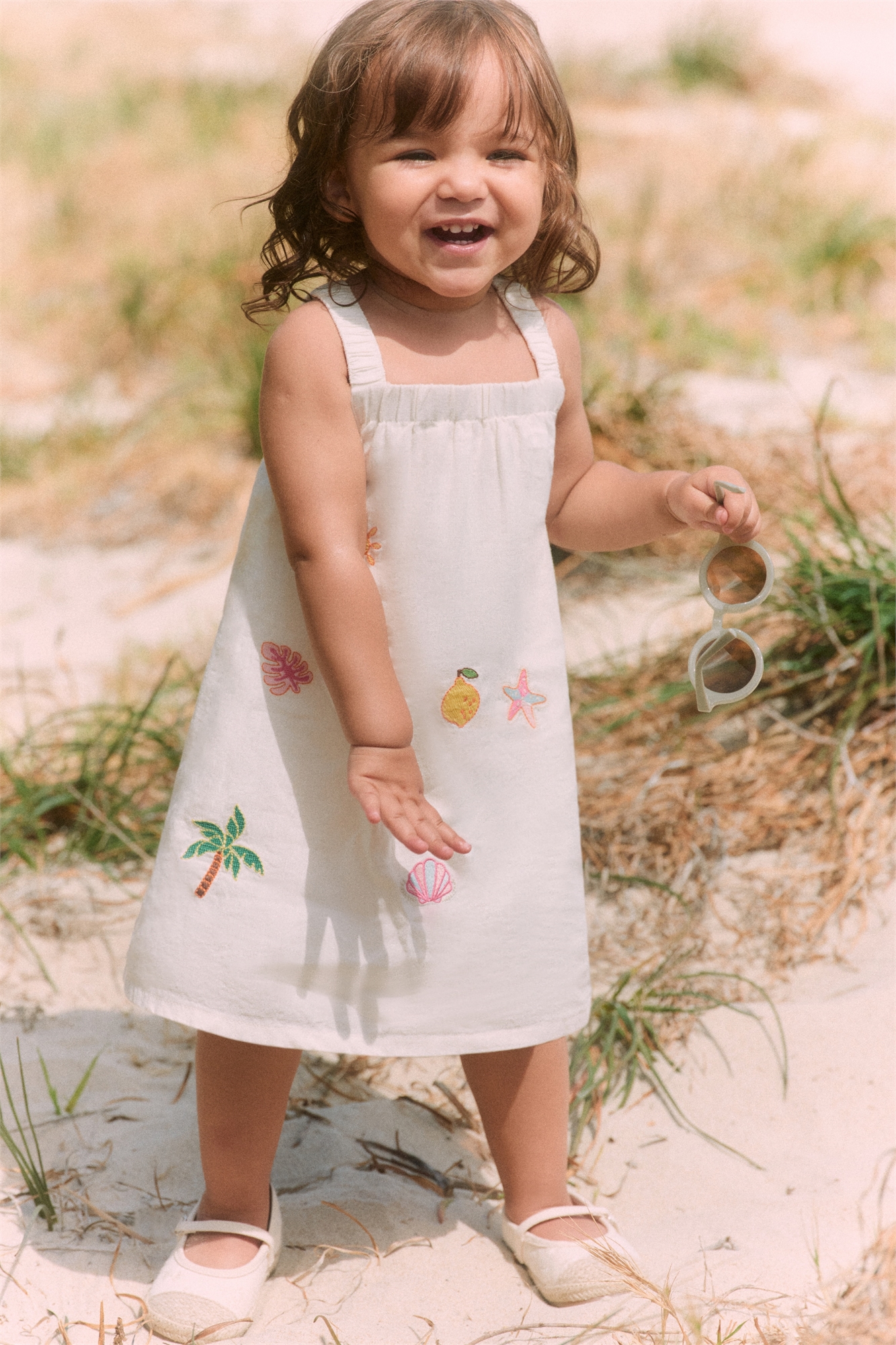 Платье А-линии из мягкого, воздушного материала из смеси хлопка и льна с небольшими вышитыми мотивами спереди. Бретели на плечах и квадратный вырез, оба с эластичной отделкой. На подкладке.