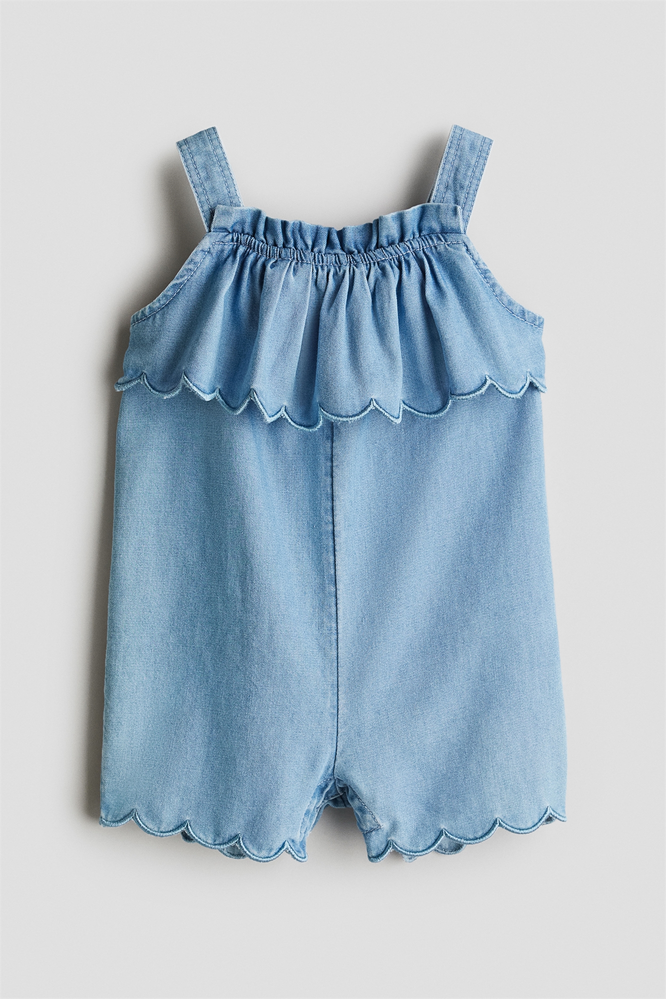Ромпер из мягкого денима с гребешковой отделкой. Бретели на плечах, квадратный вырез с отделкой оборками и широким воланом в верхней части. Скрытые застежки внизу для удобства переодевания (кроме размеров 1-4Y).