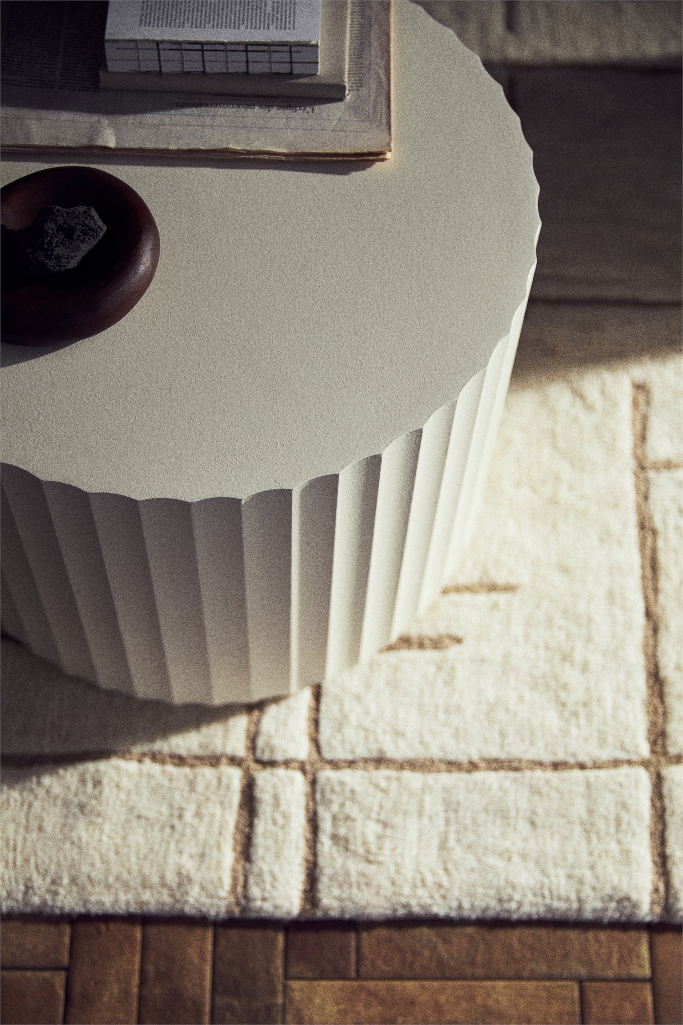 Круглый журнальный столик из МДФ с минималистичным дизайном. Рифленые бока и отделка под бетон. Мебельные прокладки из войлока под столешницей защищают пол от повреждений.