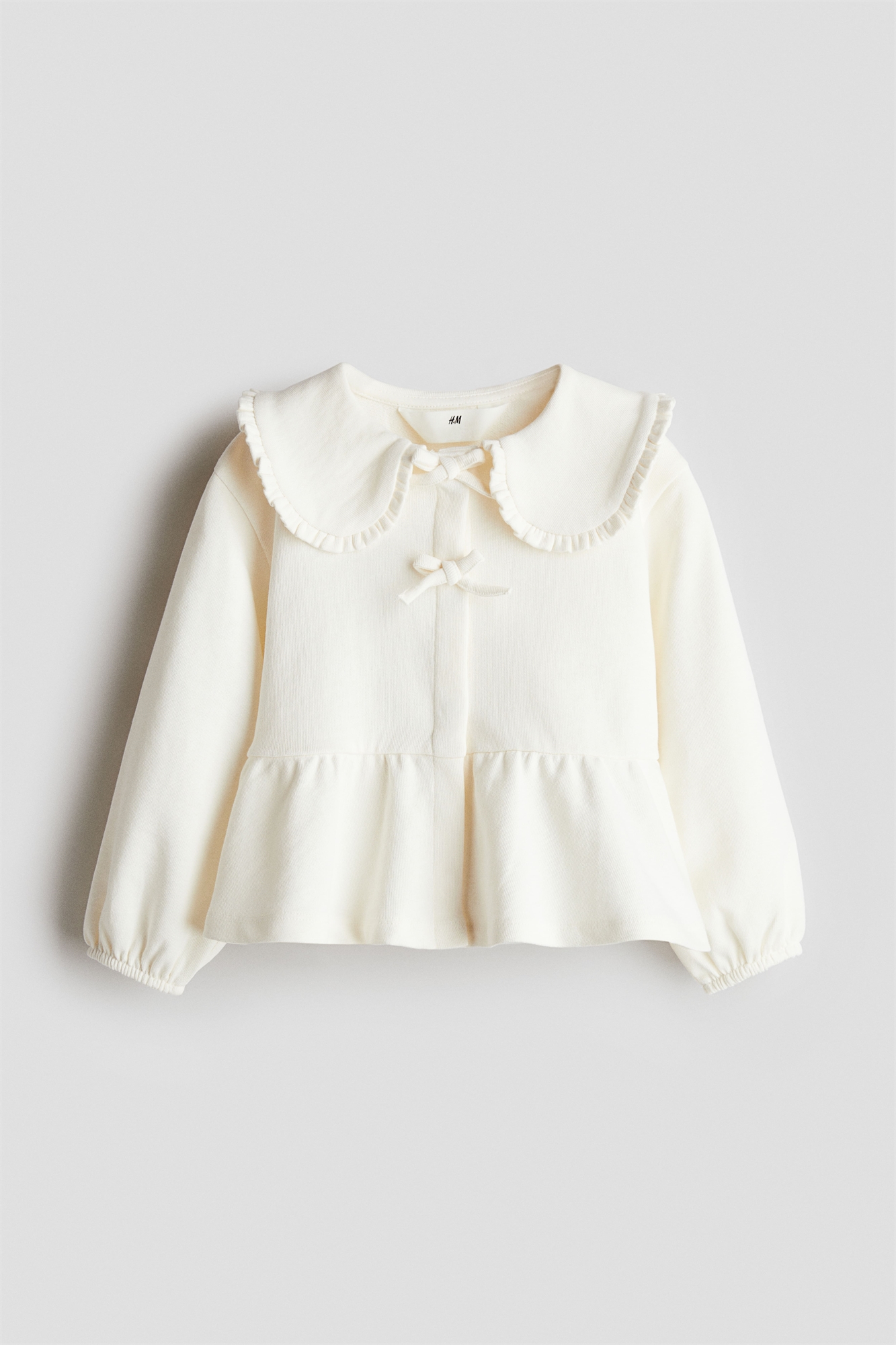 Кардиган из легкой толстоватой ткани из хлопка. Воротник "Питер Пэн" с окантовкой, декоративные банты в верхней части и потайные застежки спереди. Спущенные плечи, длинные рукава с узкой резинкой на манжетах и расклешенным пеплумом.