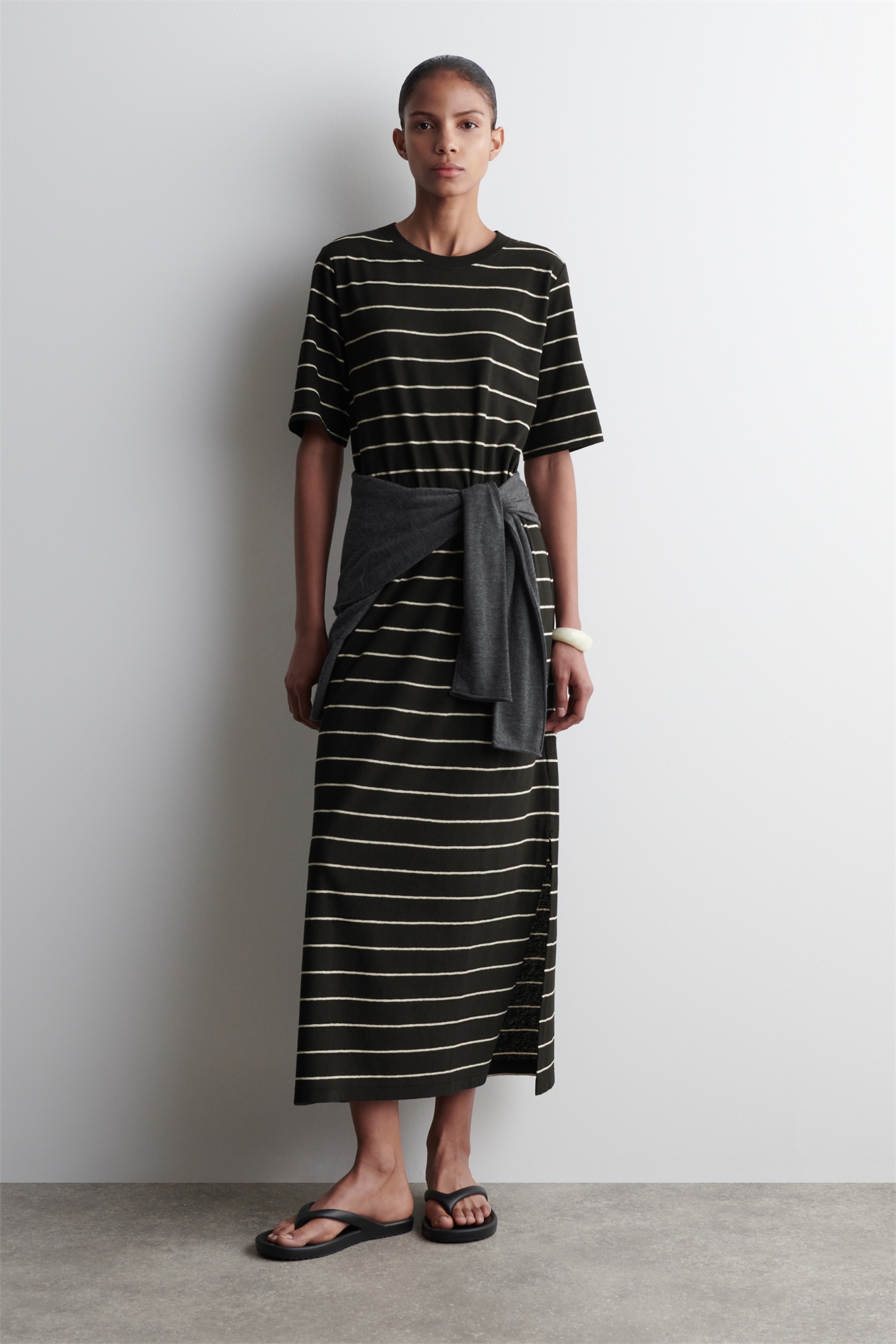 Это платье-футболка идеально подходит для солнечных дней в городе. Оно выполнено из хлопка-джерси с добавлением льна для воздухопроницаемости и имеет горловину, короткие рукава и глубокий разрез на подоле, который опускается до длины макси. Regular fit Материал: 70% хлопок, 30% лен. Без учета отделки / Машинная стирка Длина по спинке для размера S составляет 126,5 см / Модель носит размер S
