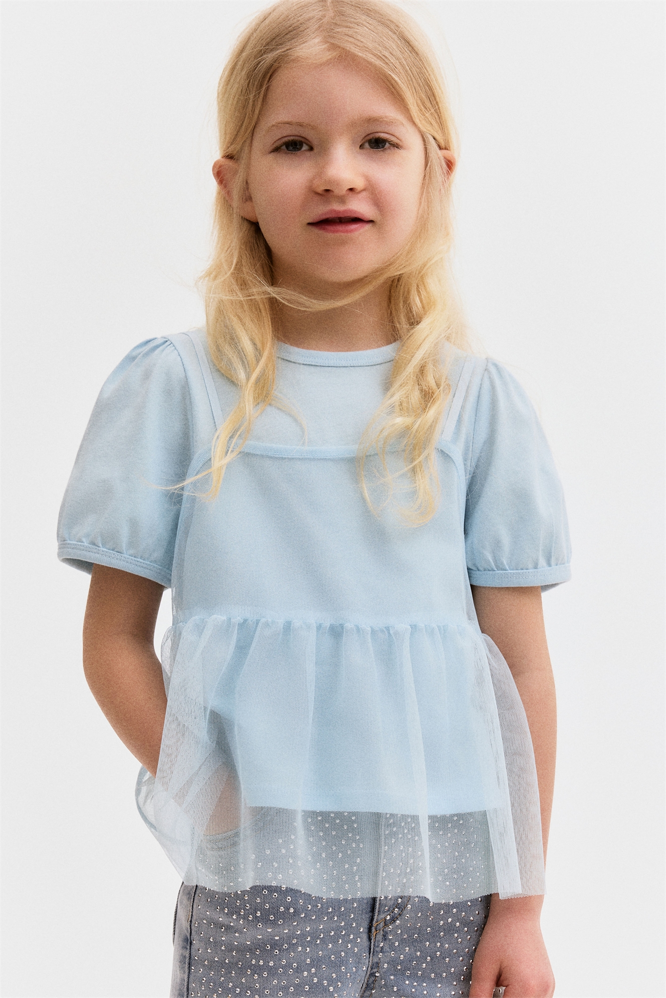 Комплект из топа на бретелях из мягкого тюля и топа из мягкого трикотажа. Топ на бретелях с квадратным вырезом и расклешенной кокеткой. Топ с круглым вырезом и короткими пышными рукавами с узкой окантовкой на манжетах.