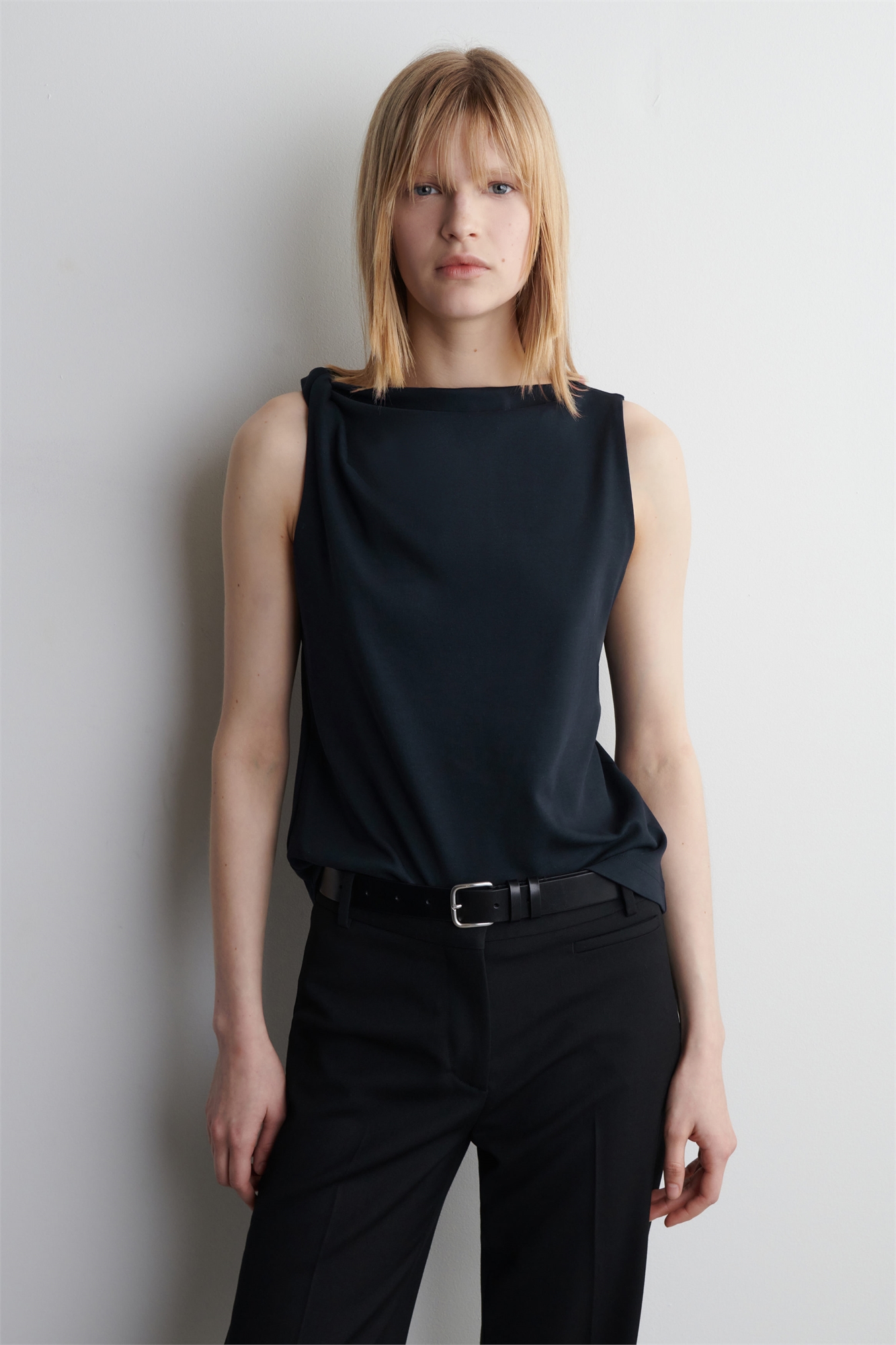 Этот современный топ, созданный из ультрамягкого хлопкового джерси, перекручивается на одном плече, создавая драпированный силуэт. Он имеет зауженный крой и выполнен в стойком темно-синем цвете, который не требует особых усилий. Зауженный крой Материал: 100% хлопок. Без учета отделки / Машинная стирка Длина по спинке для размера S составляет 56,2 см / Модель носит размер S