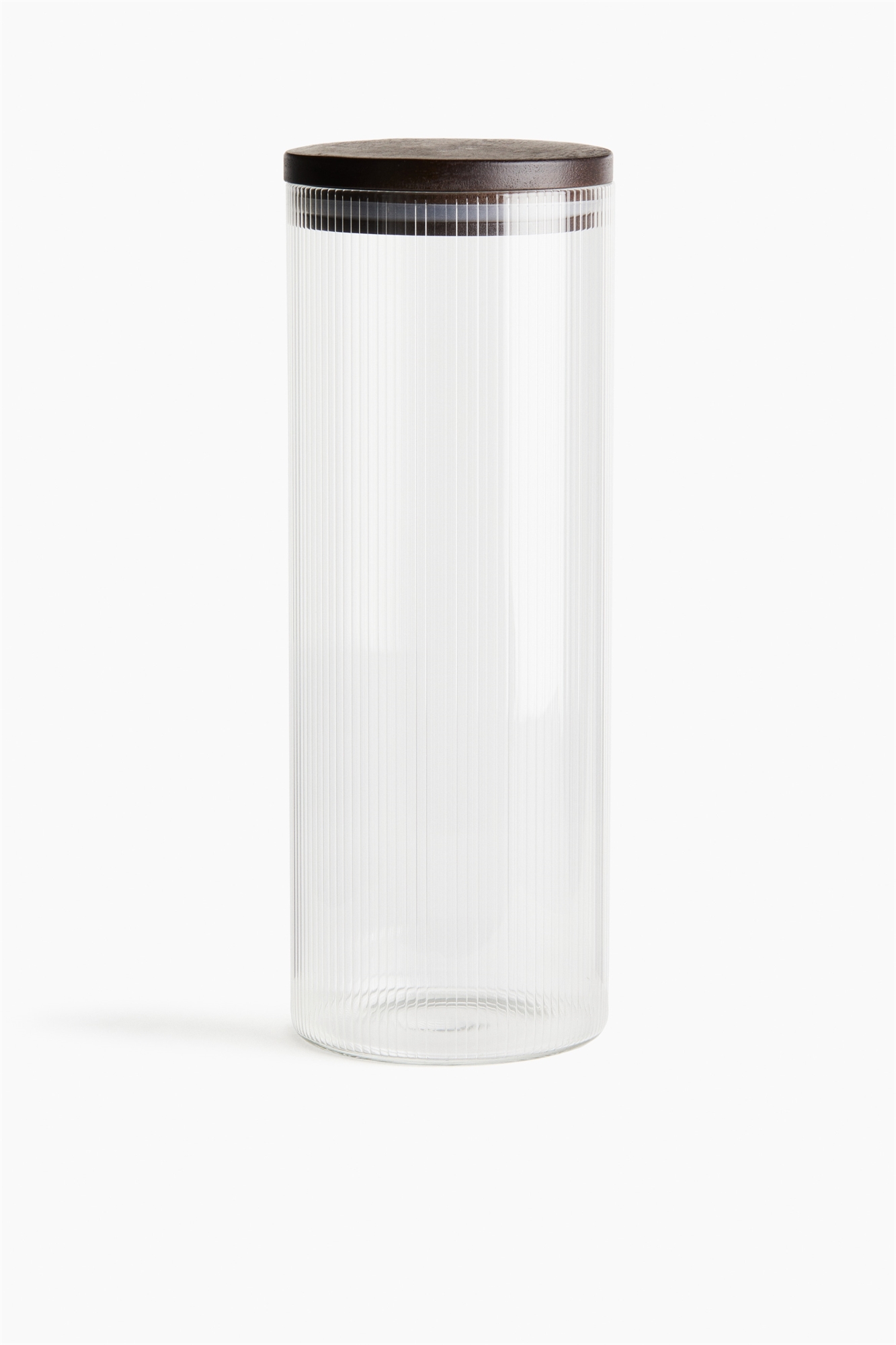 Высокая стеклянная банка с крышкой из древесины акации. Рифленый дизайн придает элегантность текстуре и деталям.