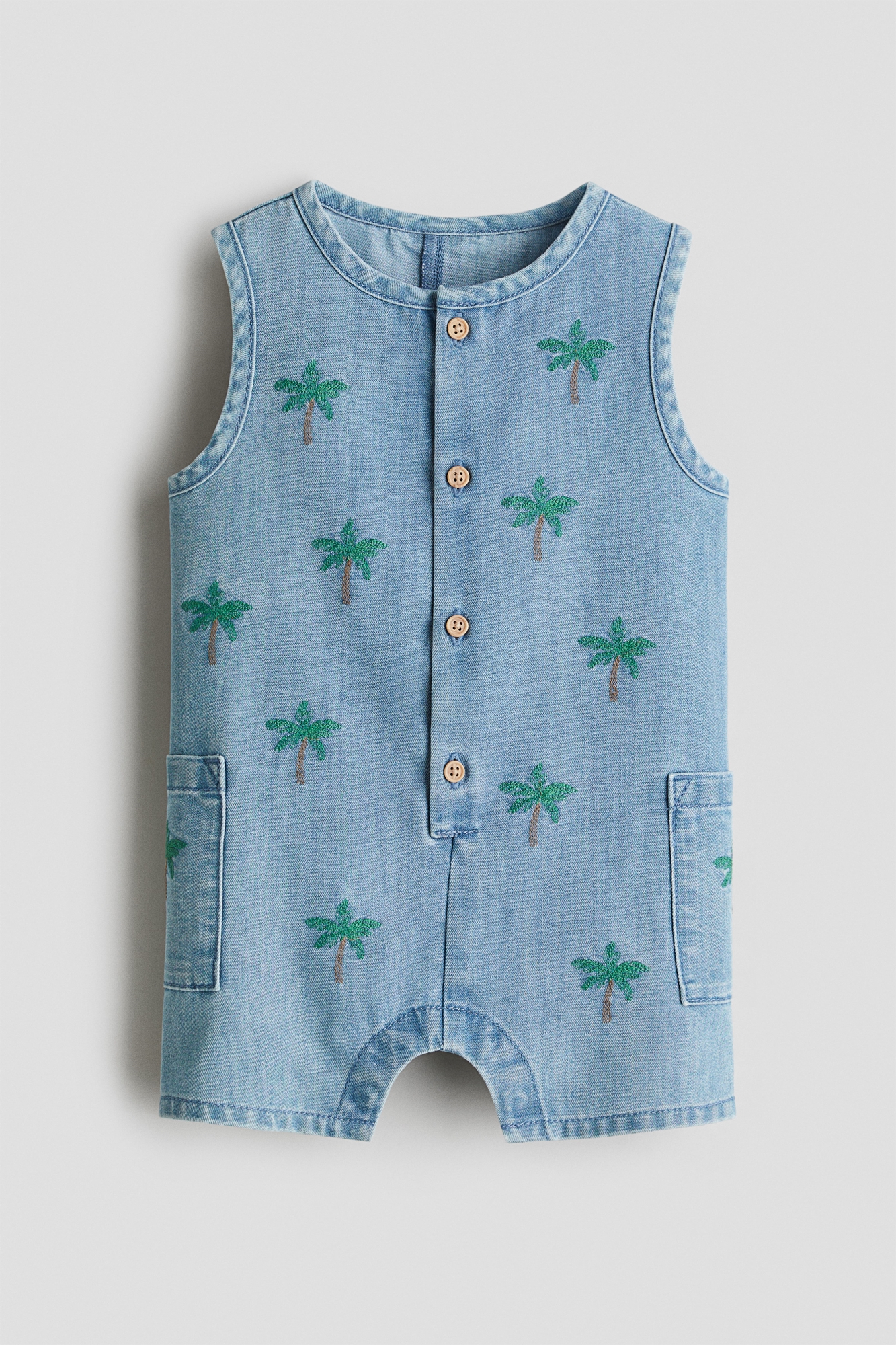 Костюм-ромпер без рукавов из мягкого денима с вышитыми мотивами спереди. Круглый вырез, пуговицы спереди и открытые накладные карманы по бокам. Скрытые кнопки внизу для удобства переодевания (кроме размеров 1-4Y).