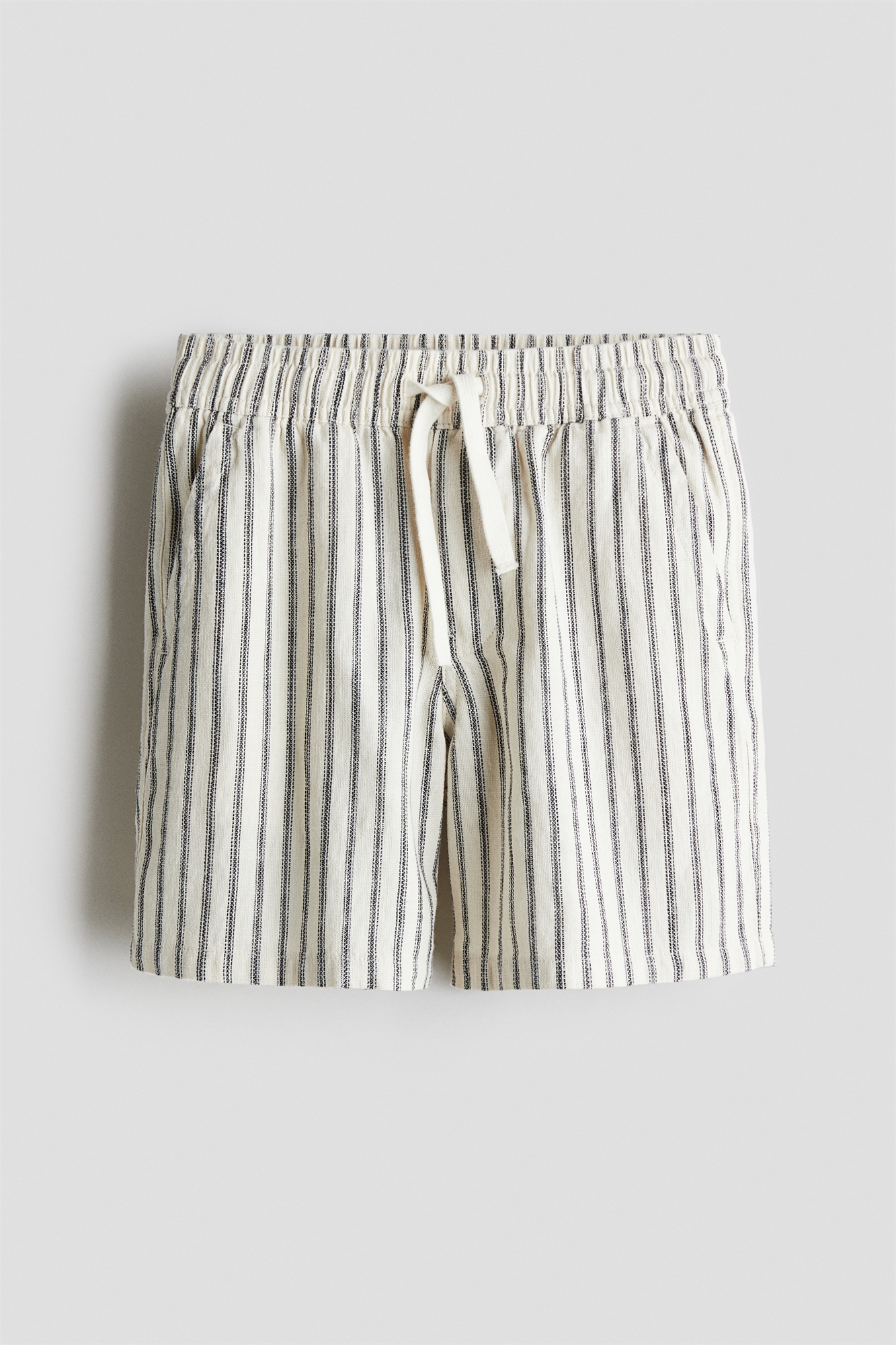 Шорты свободного кроя из фактурного хлопкового полотна с эластичным утягивающим поясом и фальшивой ширинкой. Диагональные передние карманы и открытый задний карман.