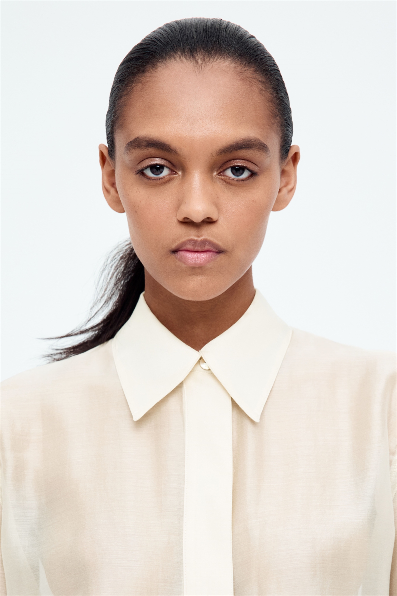 Рубашка в полотняном переплетении с воротником и потайными пуговицами до талии, подчеркивающими облегающий силуэт. Длинные рукава с разрезом и пуговицей на манжетах.