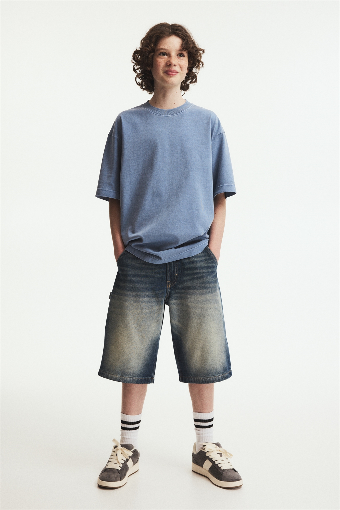 Шорты длиной до колена с 5 карманами из мягкого хлопкового денима. Свободный крой, регулируемая резинка на талии, ширинка на молнии с пуговицей и петля для молотка с одной стороны.