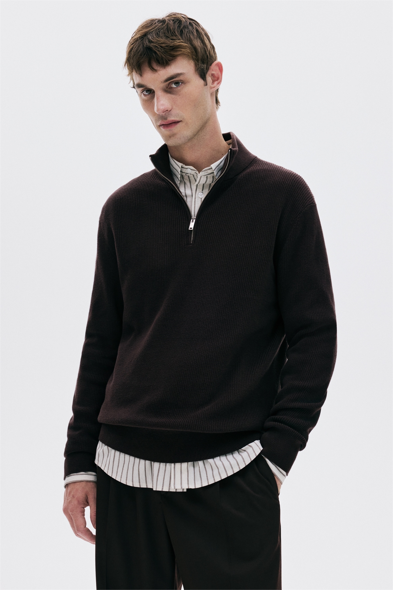 Джемпер из мягкого хлопкового трикотажа с воротником-стойкой, застежкой на молнию, длинными рукавами и прямым подолом. Регулярный крой для комфортной носки и классического силуэта.