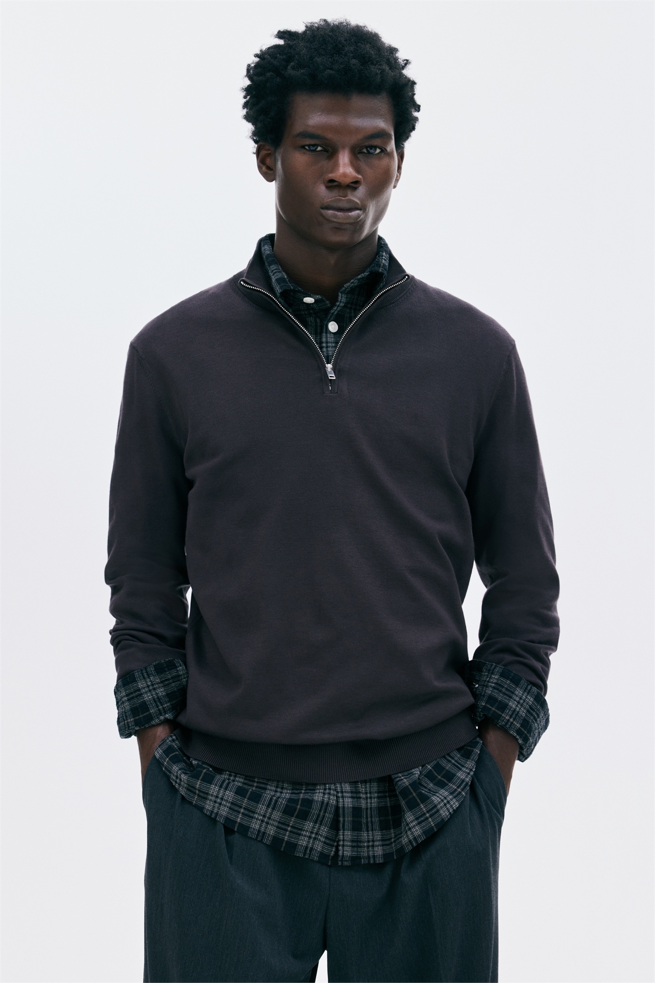 Джемпер из тонкого трикотажа с ребристым воротником-стойкой, застежкой-молнией сверху и длинными рукавами. Ребристые манжеты и подол. Регулярный крой для комфортной носки и классического силуэта.