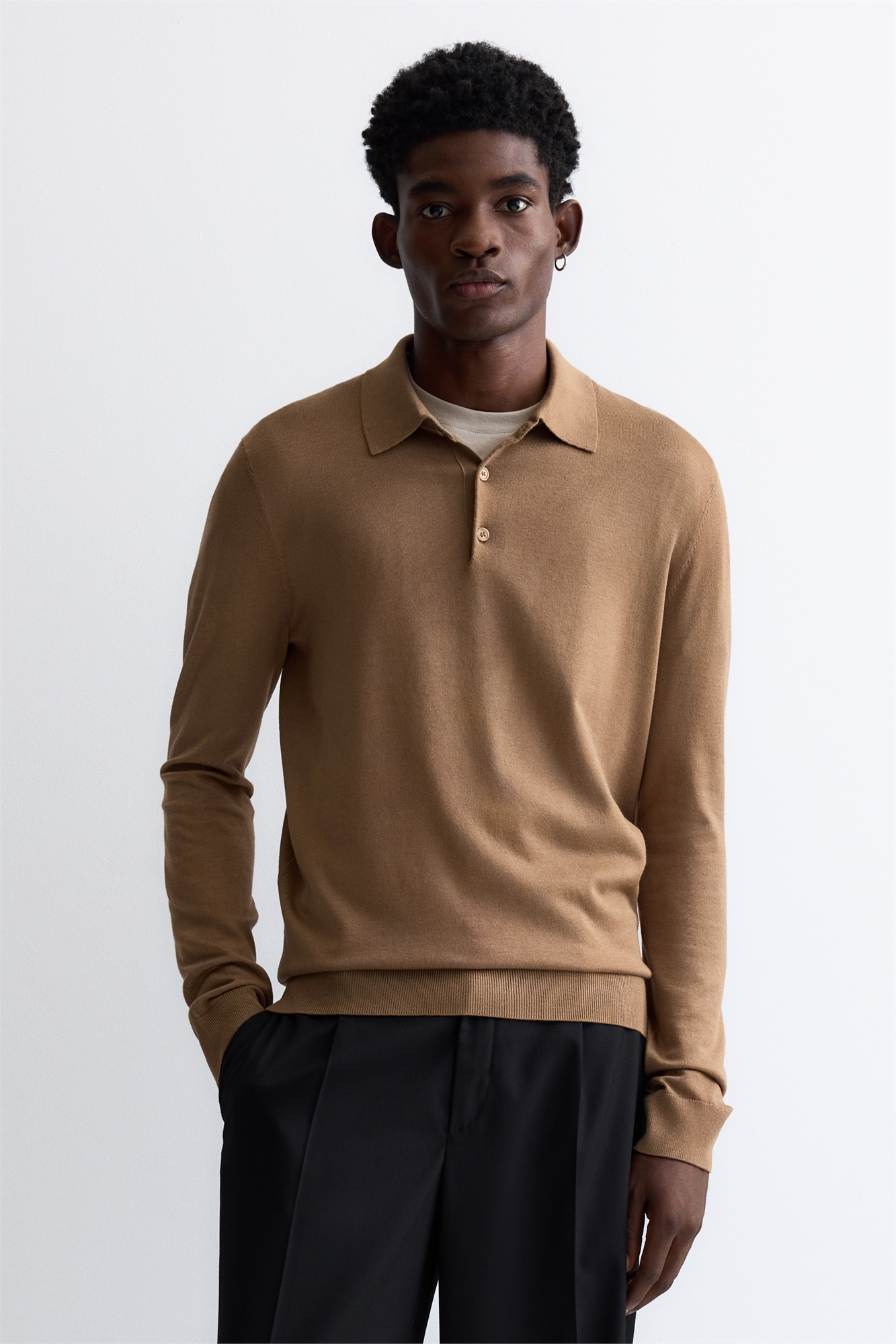Рубашка-поло с длинными рукавами из мягкого тонкого трикотажа с воротником, застежкой на пуговицы и широкой ребристой отделкой на манжетах и подоле. Регулярный крой для комфортной носки и классического силуэта.