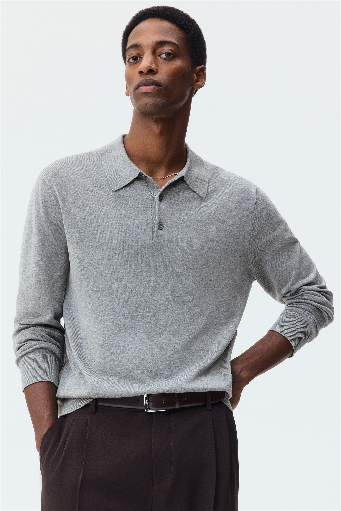 Рубашка-поло с длинными рукавами из мягкого тонкого трикотажа с воротником, застежкой на пуговицы и широкой ребристой отделкой на манжетах и подоле. Регулярный крой для комфортной носки и классического силуэта.