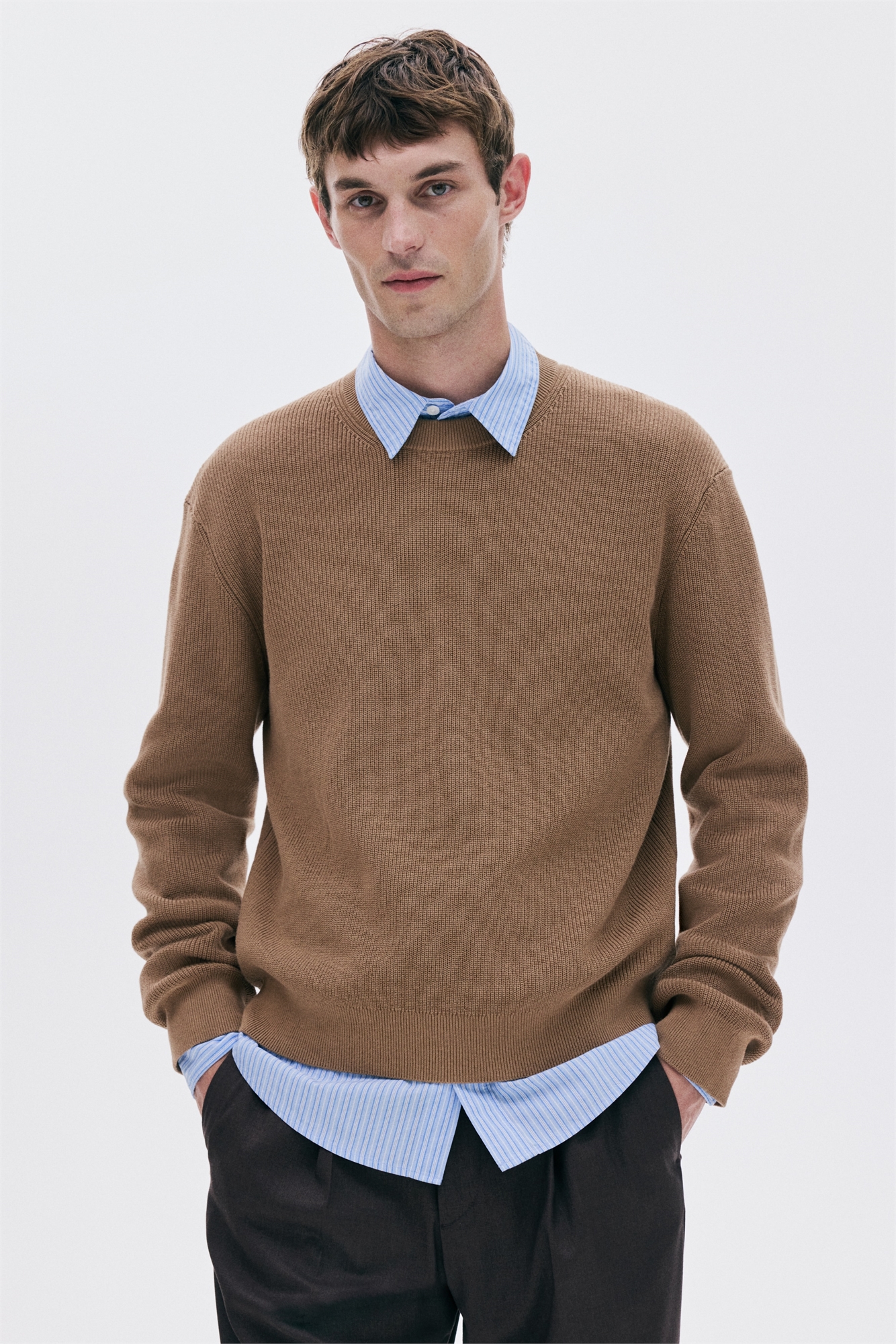 Джемпер из тонкого хлопкового трикотажа в рубчик с круглым вырезом и прямым подолом. Регулярный крой обеспечивает удобство ношения и классический силуэт.