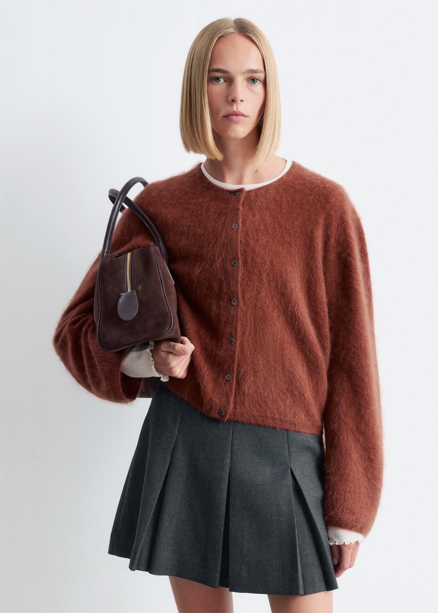 Этот кардиган связан из 100% кашемира с матовой фактурой. Короткий свободный силуэт, круглый вырез, спущенные плечи, отделка в рубчик по подолу и манжетам. Застегивается на пуговицы спереди. 100% кашемир, проверенный по стандарту The Good Cashmere Standard® от AbTF Длина кардигана: 55,5 см / 21,9" (размер S)