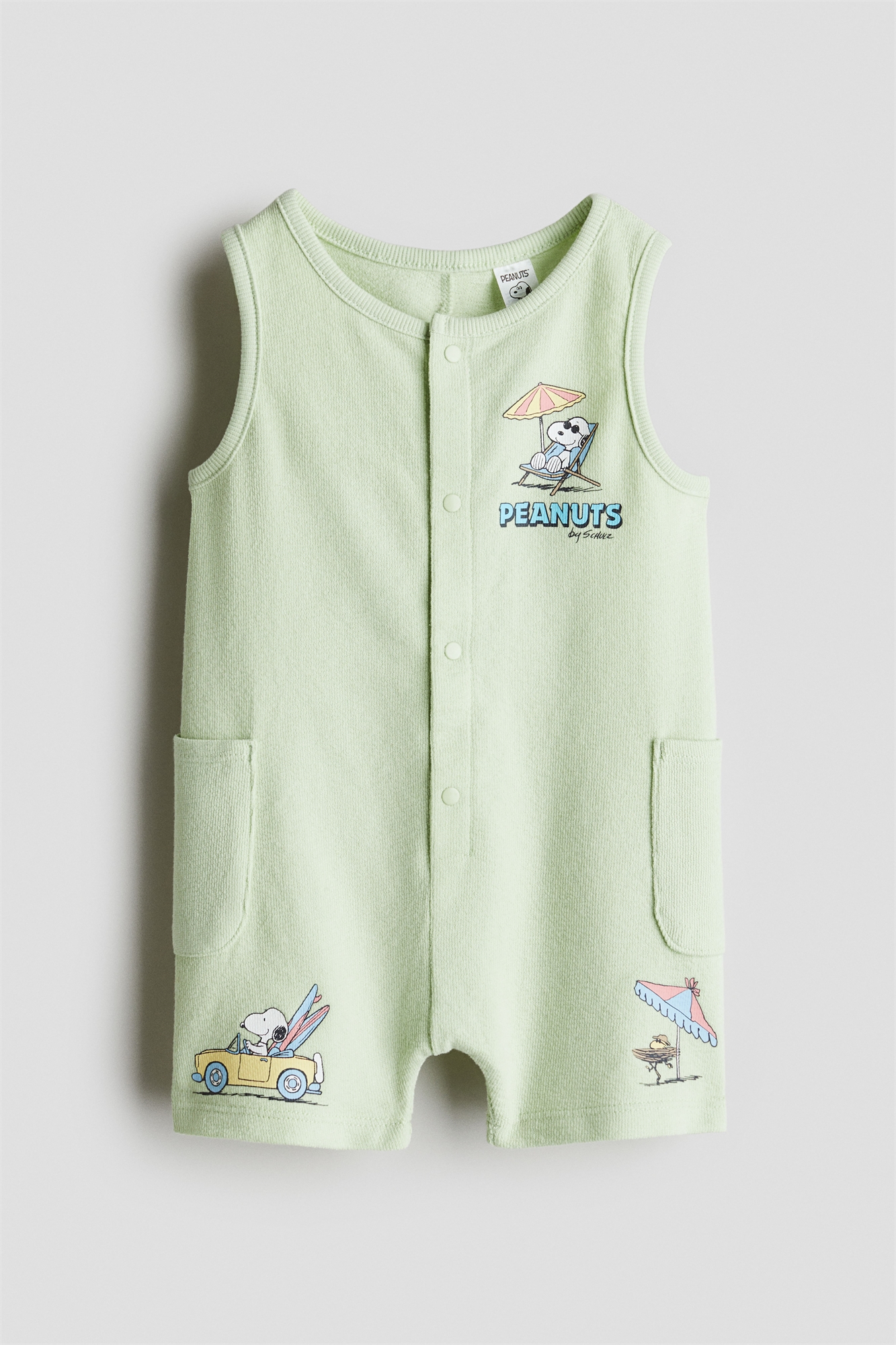 Ромпер без рукавов из мягкой, легкой хлопковой махры с принтом. Круглый вырез, застежки спереди и накладные карманы по бокам.