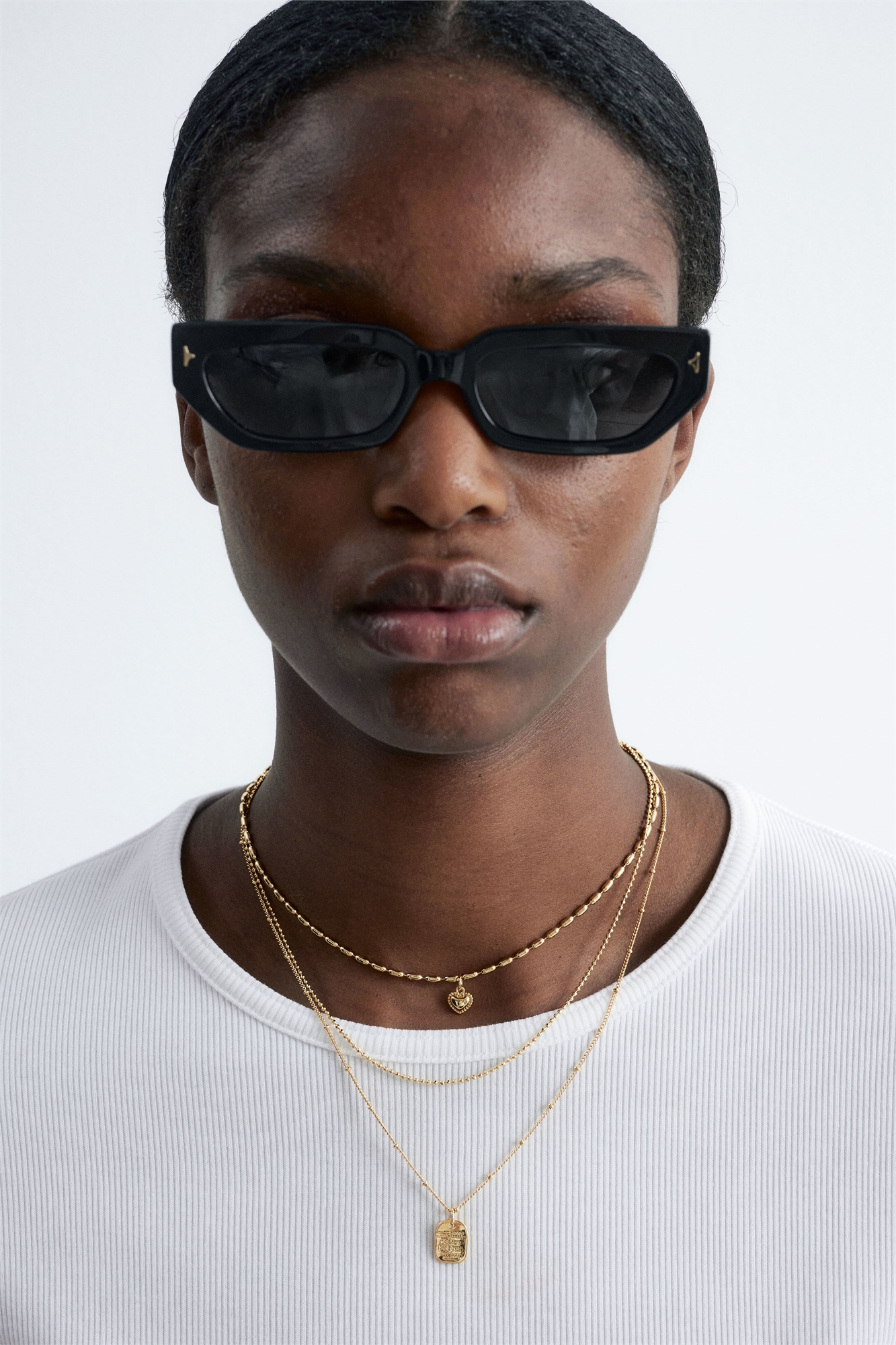 Это многослойное ожерелье из полированной латуни состоит из трех нитей: одной удлиненной цепочки с бусинами, одной шариковой цепочки и одной бордюрной цепочки с вплетенными шариковыми бусинами. На самой короткой и самой длинной цепочках имеется по подвеске. Длина самой длинной нити: 46,5 см / 18,3”