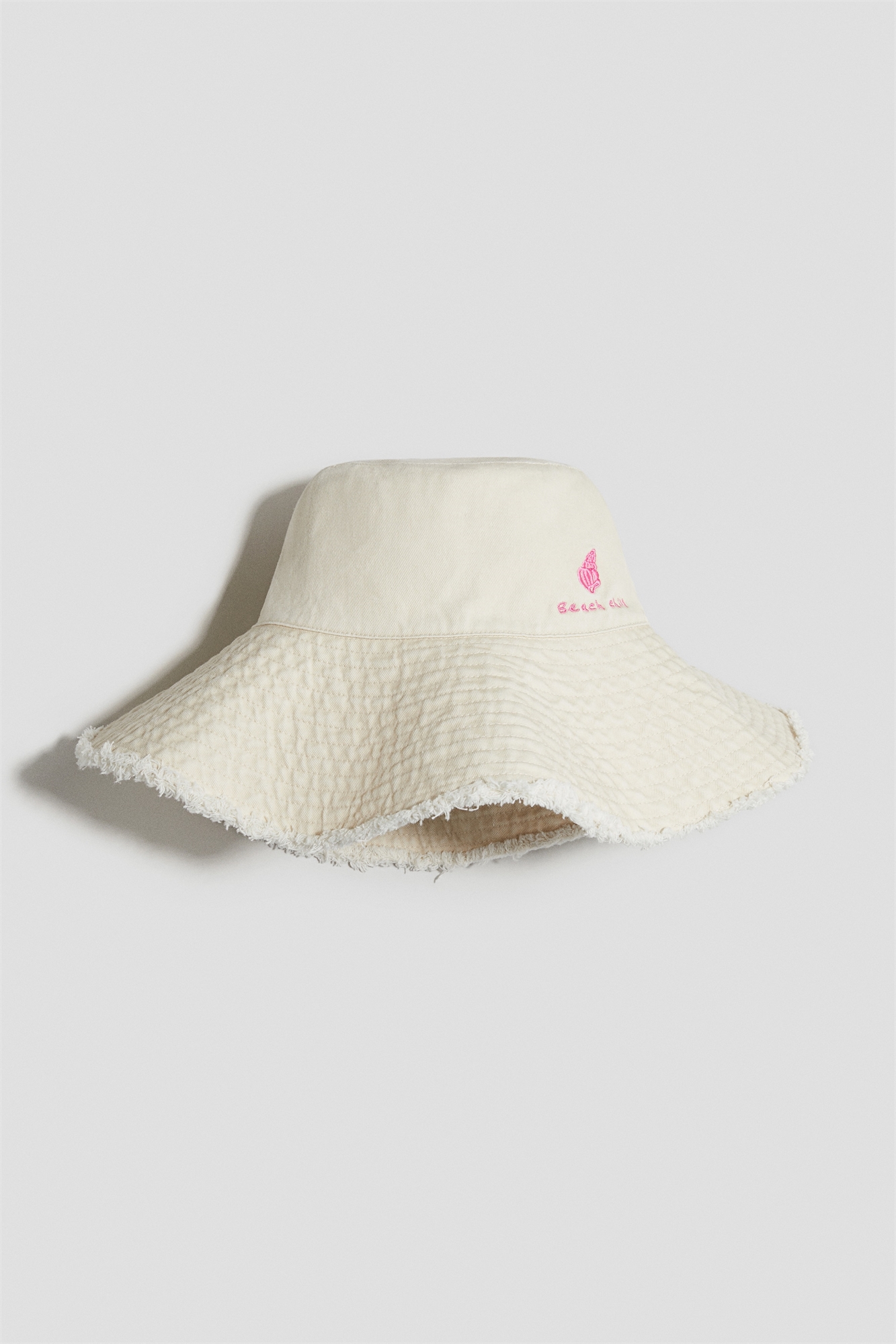 Шляпа-ведро из хлопковой саржи с вышитым мотивом спереди, с широким покатым околышем и обтрепанным краем.