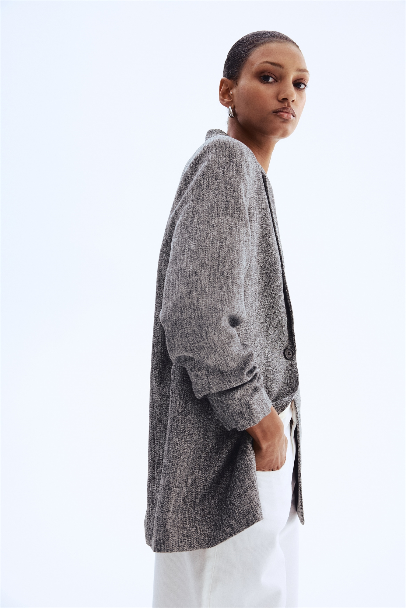 Длинный однобортный блейзер из тканого материала. Лацканы с вырезом, застежка на пуговицу спереди, талиевые вытачки и втачные передние карманы. Накладки на плечах и сборчатые рукава длиной 3/4. На подкладке.