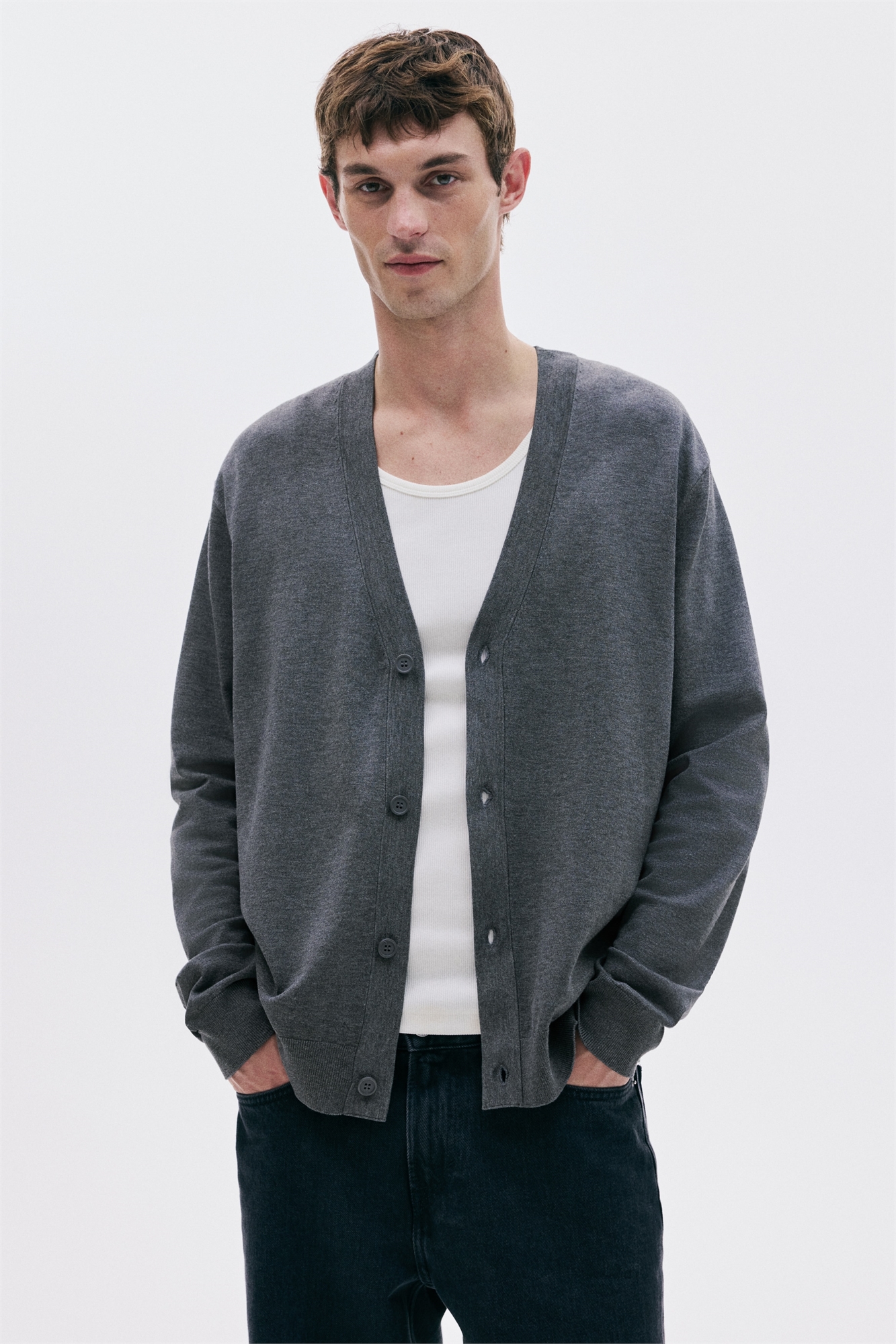 Кардиган из мягкого тонкого трикотажа с V-образным вырезом, пуговицами спереди и длинными рукавами. Регулярный крой обеспечивает удобство ношения и классический силуэт.