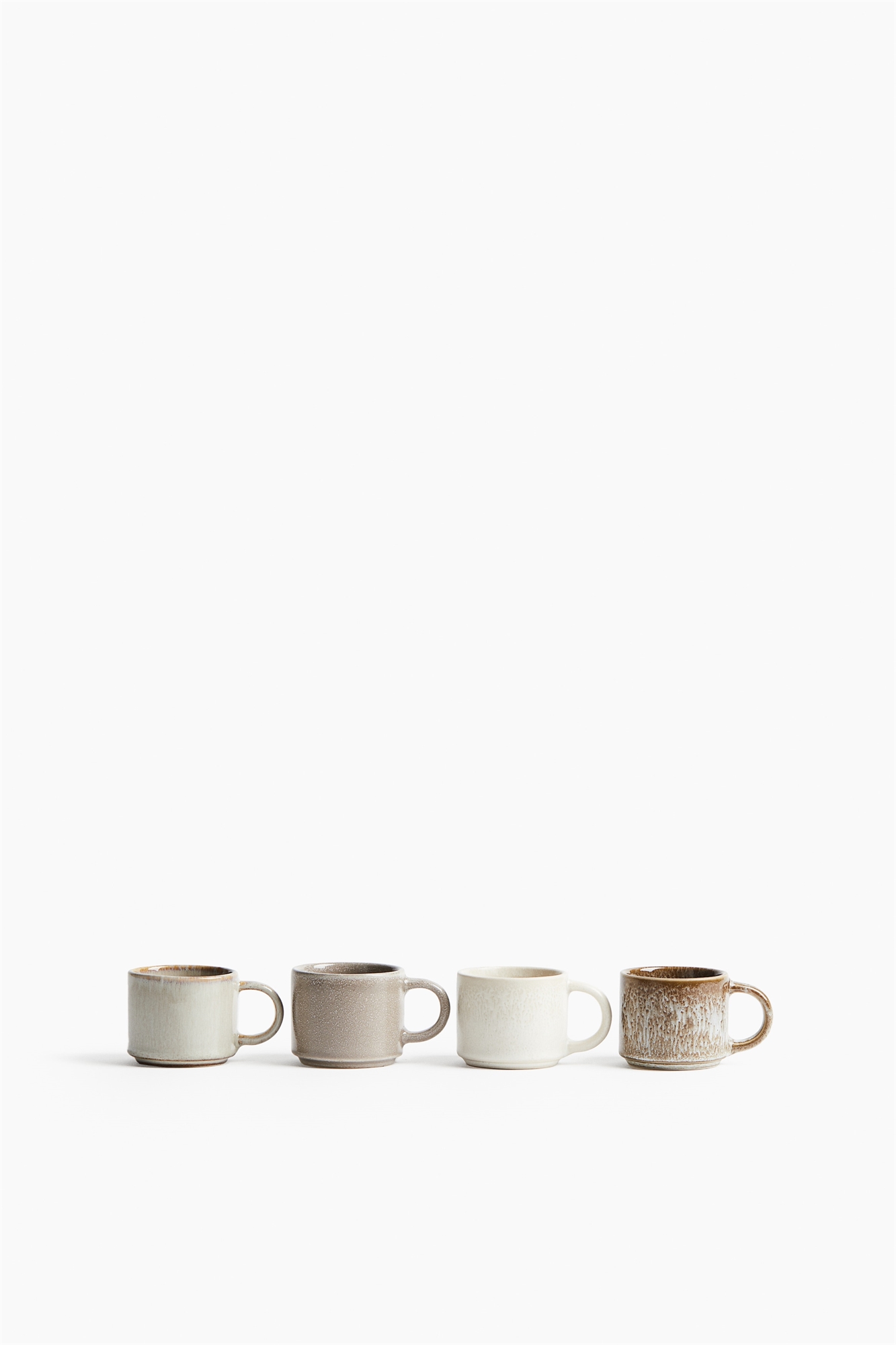 Четыре чашки для эспрессо из керамики с разными видами красивой глазури, делающей каждый предмет уникальным.