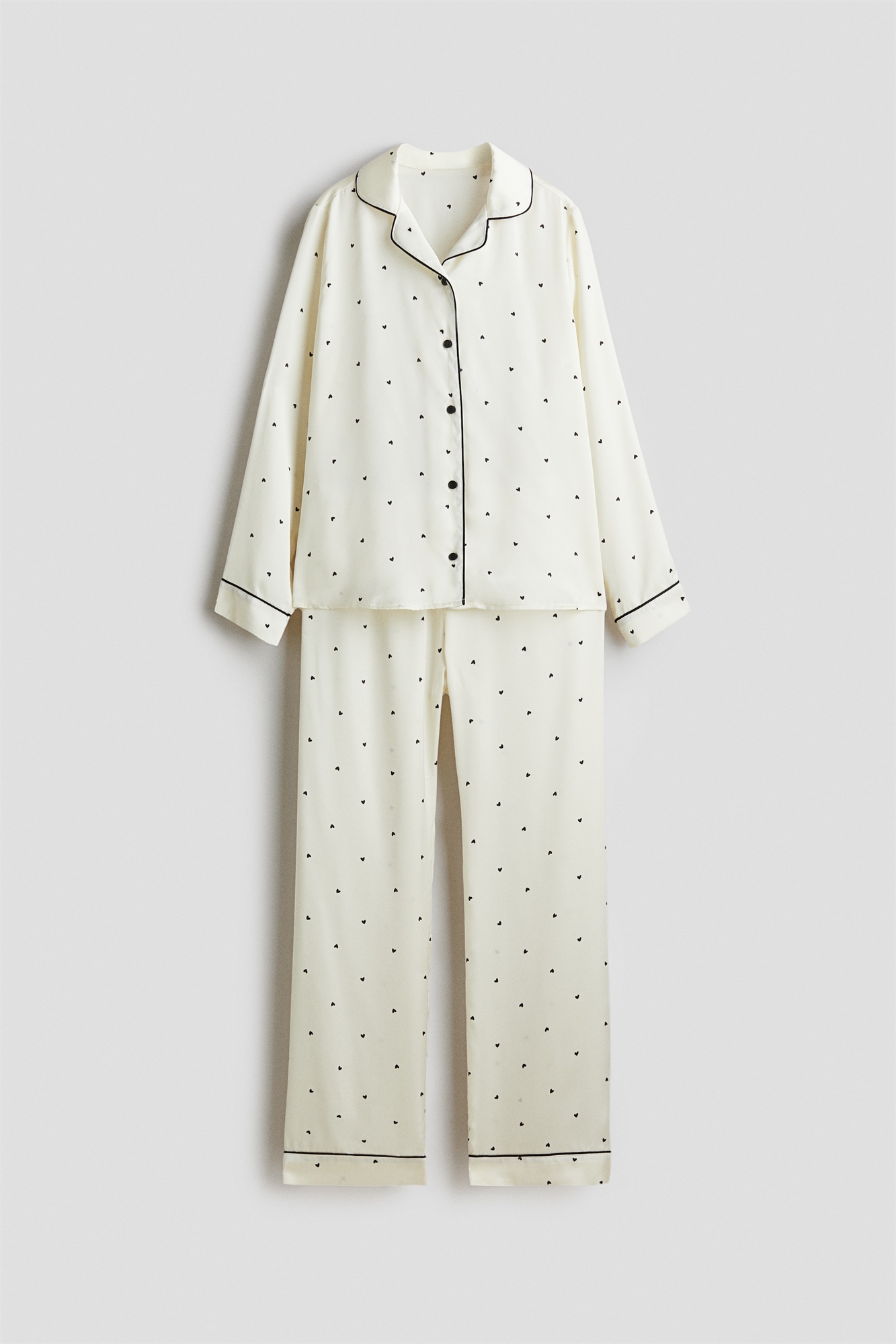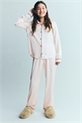 Пижама из мягкого сатина с контрастной цветной отделкой. Рубашка с длинными рукавами, воротником с отворотом и застежкой на пуговицы. Брюки с эластичным поясом и прямыми штанинами.