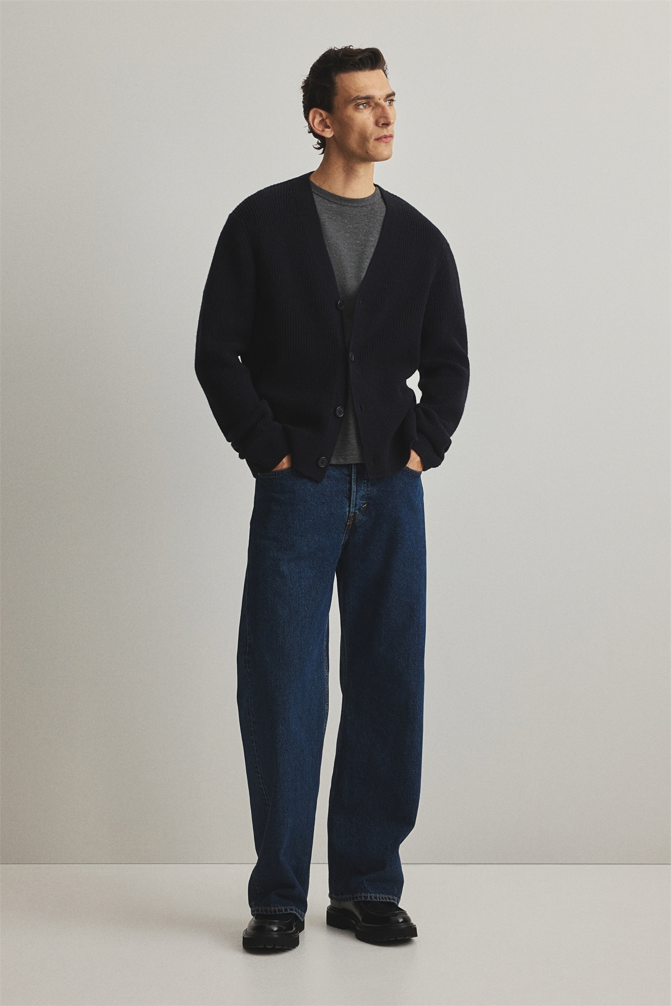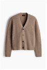 Кардиган из мягкой шерсти в рубчик, с глубоким V-образным вырезом, застежкой на пуговицы спереди и длинными рукавами. Регулярный крой обеспечивает удобство ношения и классический силуэт.