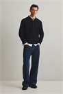 Рубашка-поло из мягкого шерстяного трикотажа с воротником, застежкой на пуговицы и длинными рукавами. Тонкая тесьма на манжетах и подоле. Регулярный крой для комфортной носки и классического силуэта.
