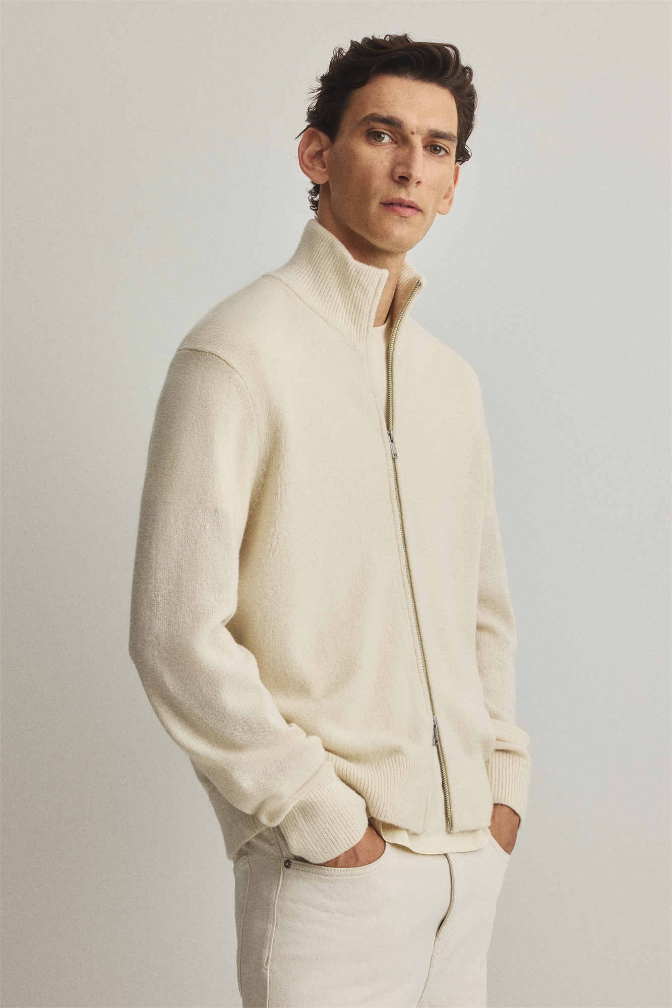 Кардиган из мягкого шерстяного трикотажа с черепаховой горловиной, двусторонней застежкой-молнией спереди, слегка спущенными плечами и длинными рукавами. Ребрышки на горловине, манжетах и подоле. Регулярный крой для комфортной носки и классического силуэта.