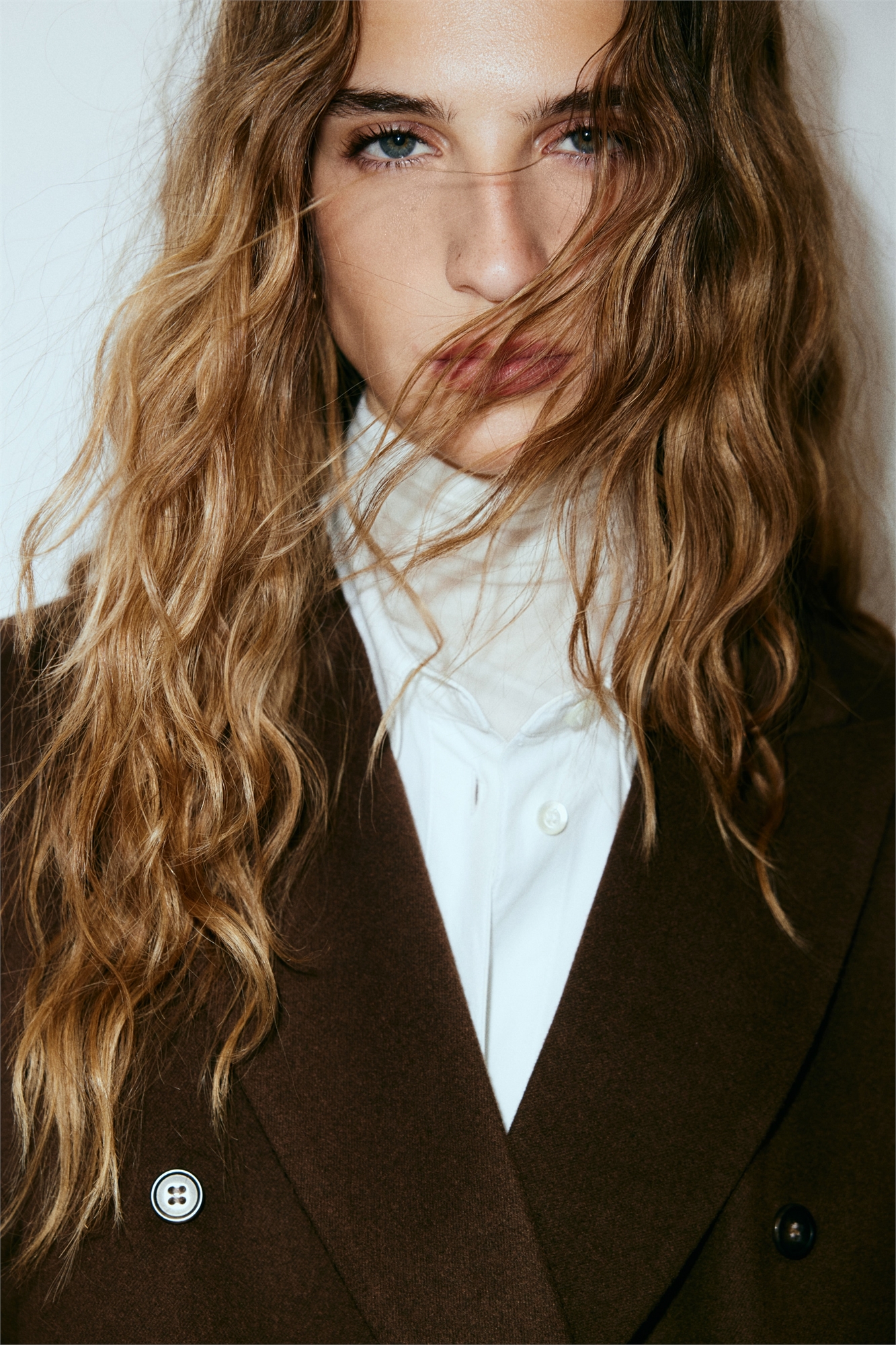 Двубортный блейзер из тканого материала с пикообразными лацканами, втачным внутренним карманом и втачными передними карманами с клапаном. Накладки на плечах, заниженная талия и пуговицы на манжетах. На подкладке.