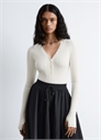 Этот боди-комбинезон изготовлен из тонкого трикотажа в рубчик с легким натяжением. Он имеет облегающий силуэт, V-образный вырез с пуговицами и длинные рукава покроя реглан с отверстиями для больших пальцев. Застегивается на пуговицы на ластовице. Длина тела: 75,5 см / 29,8” (размер S)