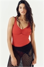 Полностью закрытый купальник с V-образным вырезом горловины, плотно облегающий талию. Регулируемые бретели и чашечки со съемными вкладышами, придающими форму бюсту и обеспечивающими хорошую поддержку. Сборчатый шов по центру бюста и средняя степень защиты сзади.