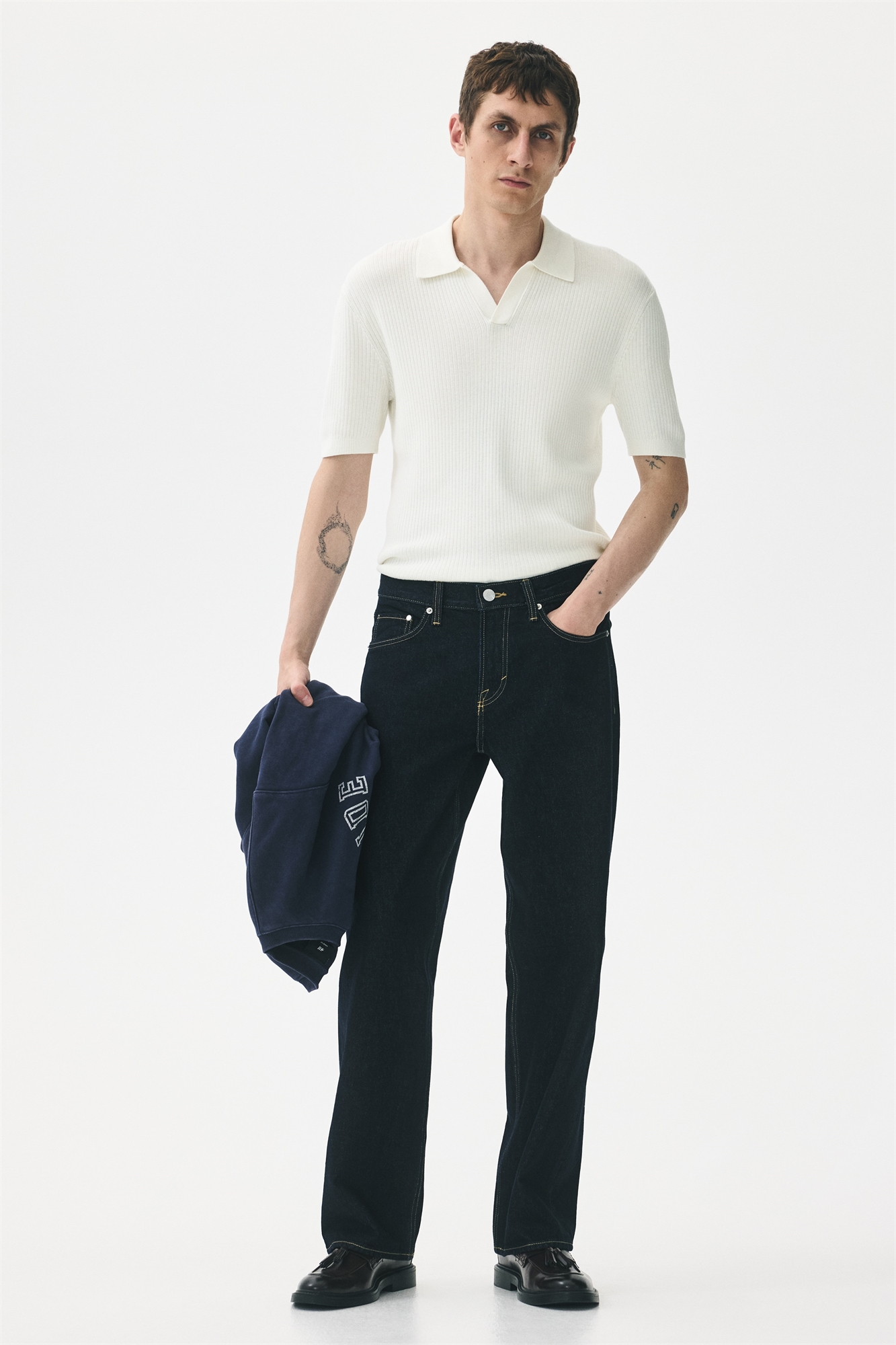 Рубашка-поло в рубчик из хлопкового трикотажа с воротником, небольшим V-образным разрезом в верхней части, короткими рукавами и прямым подолом. Зауженный крой, облегающий контуры тела и создающий приталенный силуэт.
