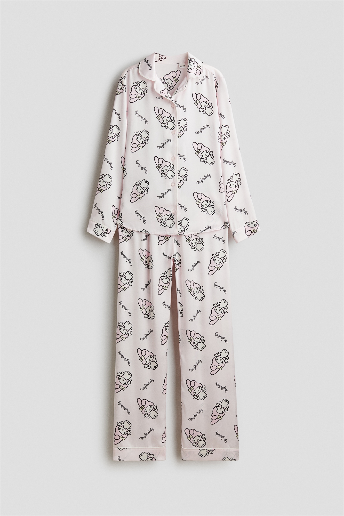 Пижама с рубашкой и нижней частью из мягкого набивного атласа с контрастной цветной отделкой. Рубашка с длинными рукавами, отложным воротником и мягко закругленным подолом. Нижние штанишки с эластичной резинкой на талии и прямыми ножками.
