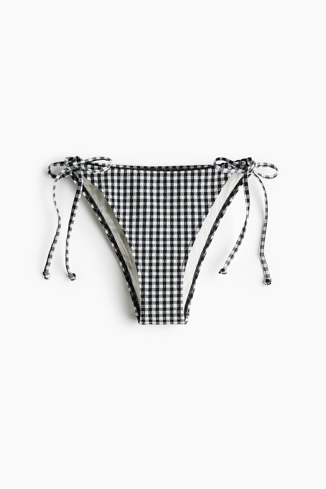 Трусики-бикини на подкладке, со средней талией, завязками по бокам и вырезом сзади.
