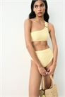 Бикини на подкладке с одной широкой бретелью с металлической деталью спереди, которая создает мягкую драпировку. Чашечки со съемными вставками, придающими форму бюсту и обеспечивающими хорошую поддержку. Без застежек.