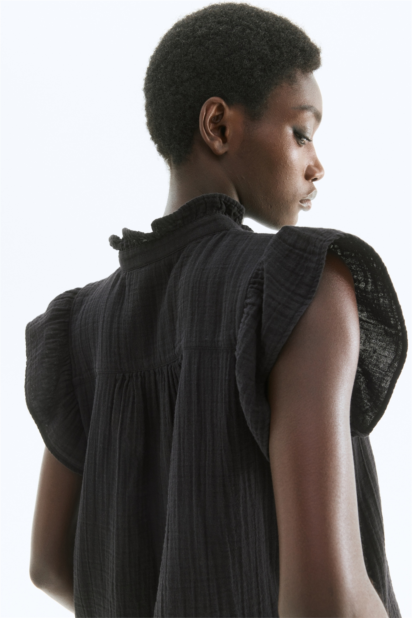 Блузка из мягкого хлопкового муслина с жатым воротником и пуговицами спереди. Рукава с воланами, ярмо со складками сзади и прямой подол.