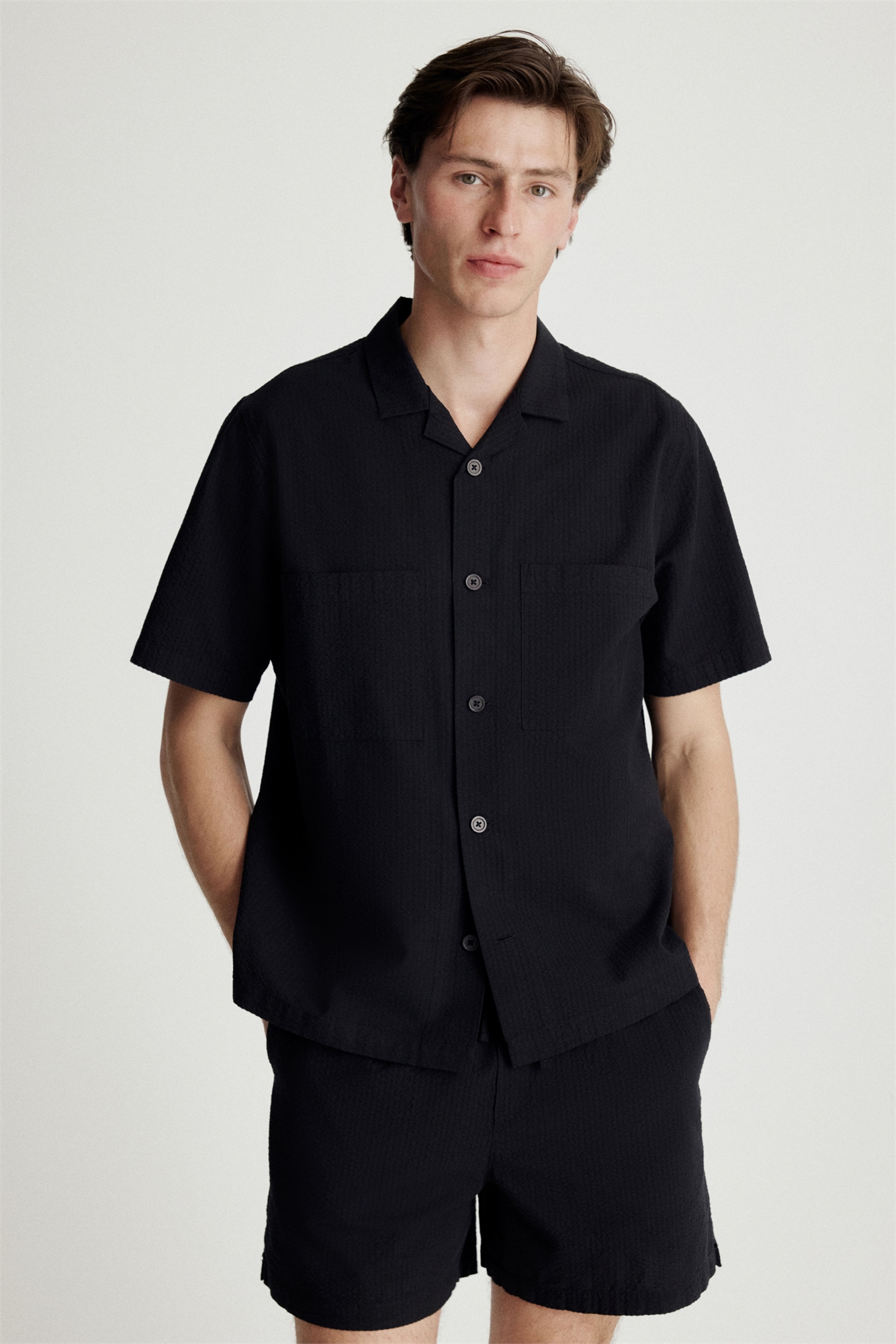 Пижама с рубашкой и шортами из хлопкового сирсакера. Рубашка с короткими рукавами, отложным воротником, французской застежкой, нагрудными карманами и прямым подолом. Шорты с эластичной утягивающейся талией, диагональными боковыми карманами и открытым задним карманом.
