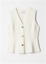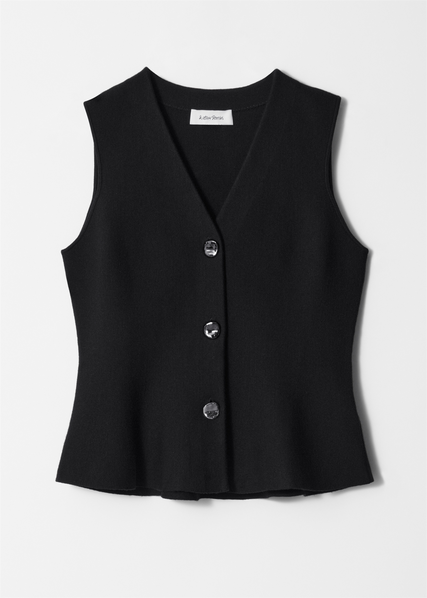 Этот трикотажный жилет приталенного силуэта с классическим V-образным вырезом и небольшим разрезом на подоле. Минималистичный дизайн дополнен металлическими пуговицами спереди. Сочетайте его с юбкой в тон для создания элегантного совместного образа или наденьте его с джинсами. Длина жилета: 56,5 см / 22,2 дюйма (размер S)