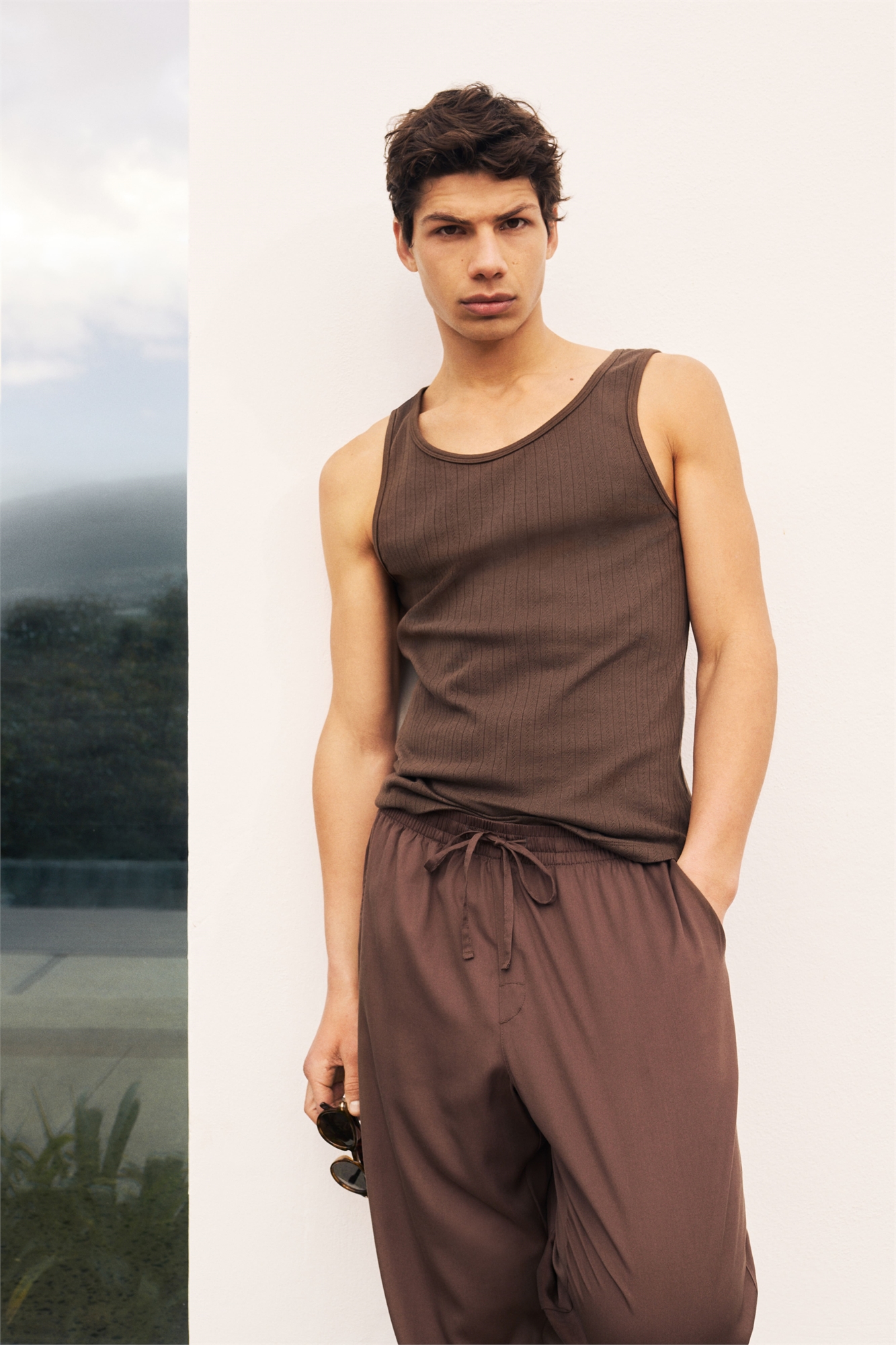 Пижама с жилетом из хлопкового джерси с пуантелью и нижними брюками из мягкого лиоцеллового плетения. Верхняя часть жилета с круглым вырезом и прямым покроем. Низ с эластичным материалом и завязками на талии, фальшивой ширинкой и диагональными боковыми карманами.