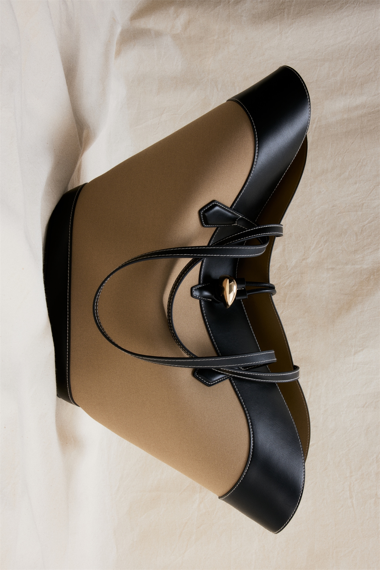 Шоппер с характерными скошенными боками и волнистым верхним краем. Узкие ручки и закладка сверху, которая застегивается на блестящую металлическую деталь спереди. На подкладке.