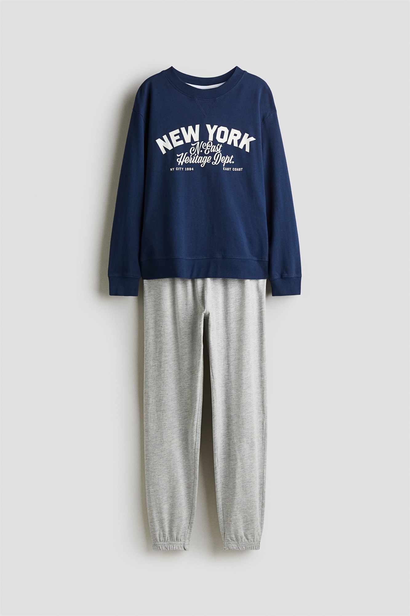 Пижама с верхом и низом из мягкого хлопкового джерси. Футболка с длинными рукавами с принтом, круглым вырезом с ребристой отделкой, слегка спущенными плечами. Ребрышки на манжетах и подоле. Нижние штанишки с резинкой на талии и подоле.