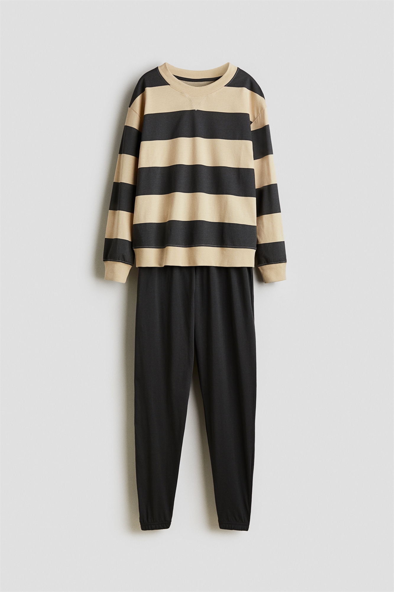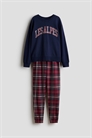 Пижама с верхом и низом из мягкого хлопкового джерси. Футболка с длинными рукавами с принтом, круглым вырезом с ребристой отделкой, слегка спущенными плечами. Ребрышки на манжетах и подоле. Нижние штанишки с резинкой на талии и подоле.