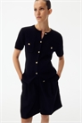 Кардиган с короткими рукавами из хлопка ребристой вязки с круглым вырезом, металлическими пуговицами спереди и накладными нагрудными карманами с пуговицей.
