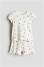 Комплект из топа и шорт из мягкого ребристого хлопкового джерси. Топ с короткими рукавами, круглым вырезом и кнопками на одном плече (кроме размеров 2-4Y). Шорты с эластичной талией и оборкой по краю.